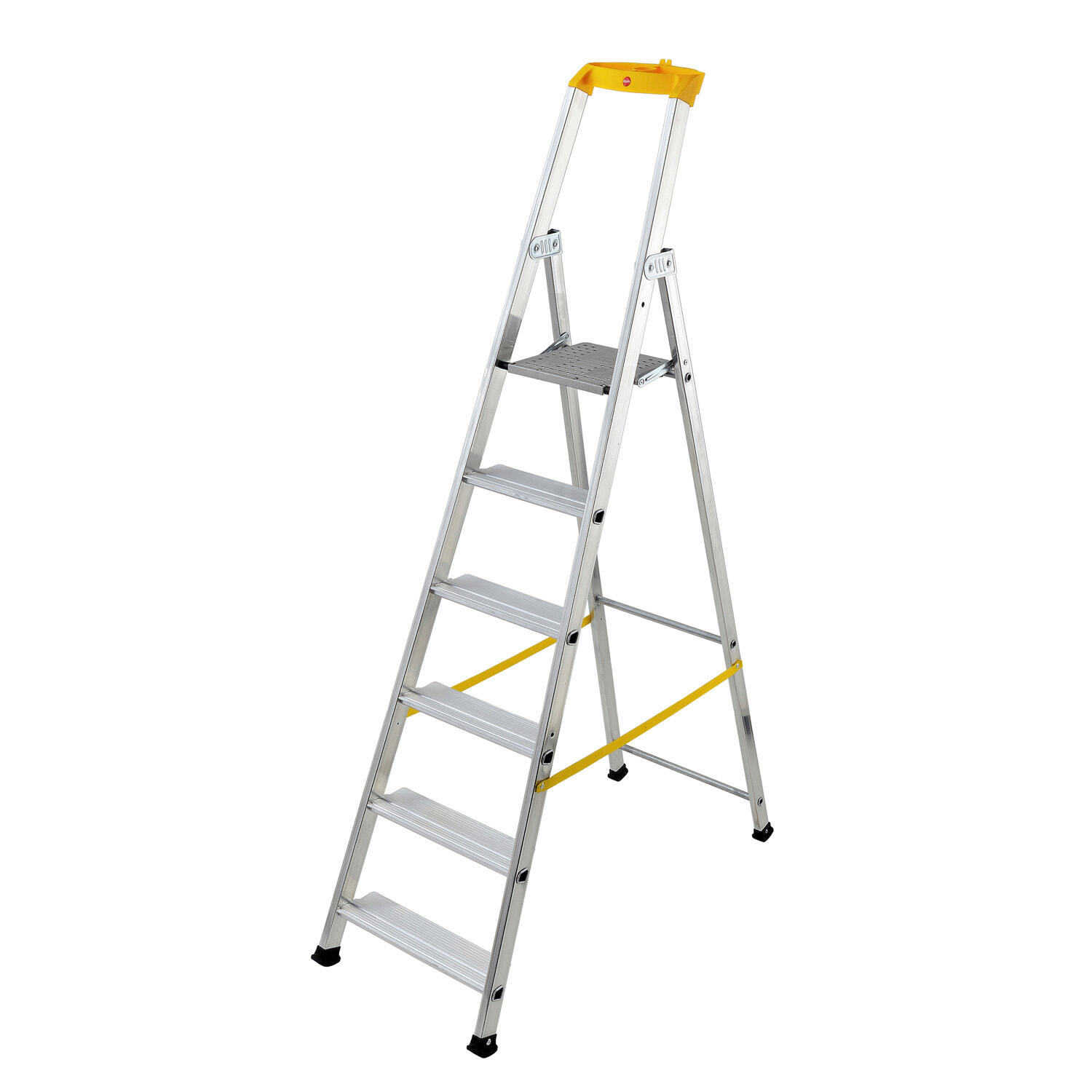 Escabeau professionnel 6 marches disposant de marches larges (11 cm) à striures antidérapantes avec retour de matière anti-coupures, d'une solide structure en aluminium avec renforts postérieurs et des articulations en acier pour une plus grande stabilité. Il dispose également d'une tablette porte-outils et de patins antidérapants fixés aux montants pour vous offrir une meilleure stabilité et plus d'adhérence au sol