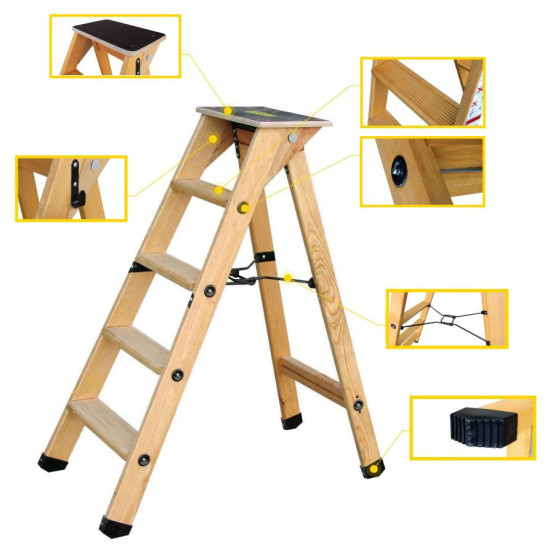 CONFORTABLE Accès par larges marches striées. Les marches sont renforcées par une tige métallique et des écrous qui permettent de resserrer chaque marche. SECURISANT Ferrure d'ouverture en acier à blocage automatique. PRATIQUE Large tablette multiplis avec revêtement anidérapant. Crochet de suspension sur le côté (à partir du 5 marches). LASURE DE PROTECTION ANTI-UV