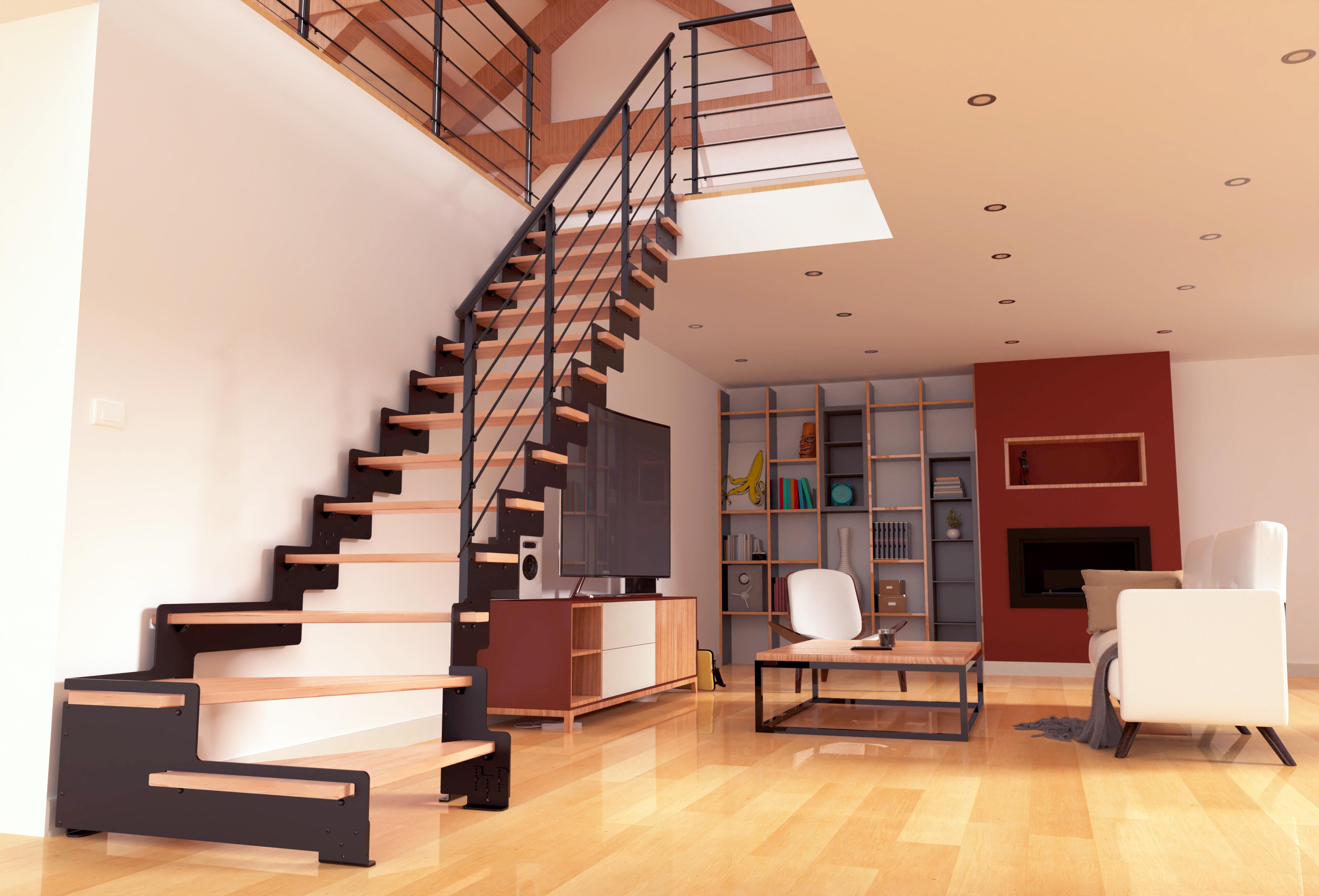 Escalier 1/4 tournant noir, hauteur sol à sol fini 275cm. Rampe en option. Continuité sur mezzanine en option vendu en kit de 2m. Existe en version droit et 1/4 tournant. Marches en hêtre brut, hêtre verni, frêne brut, frêne verni.