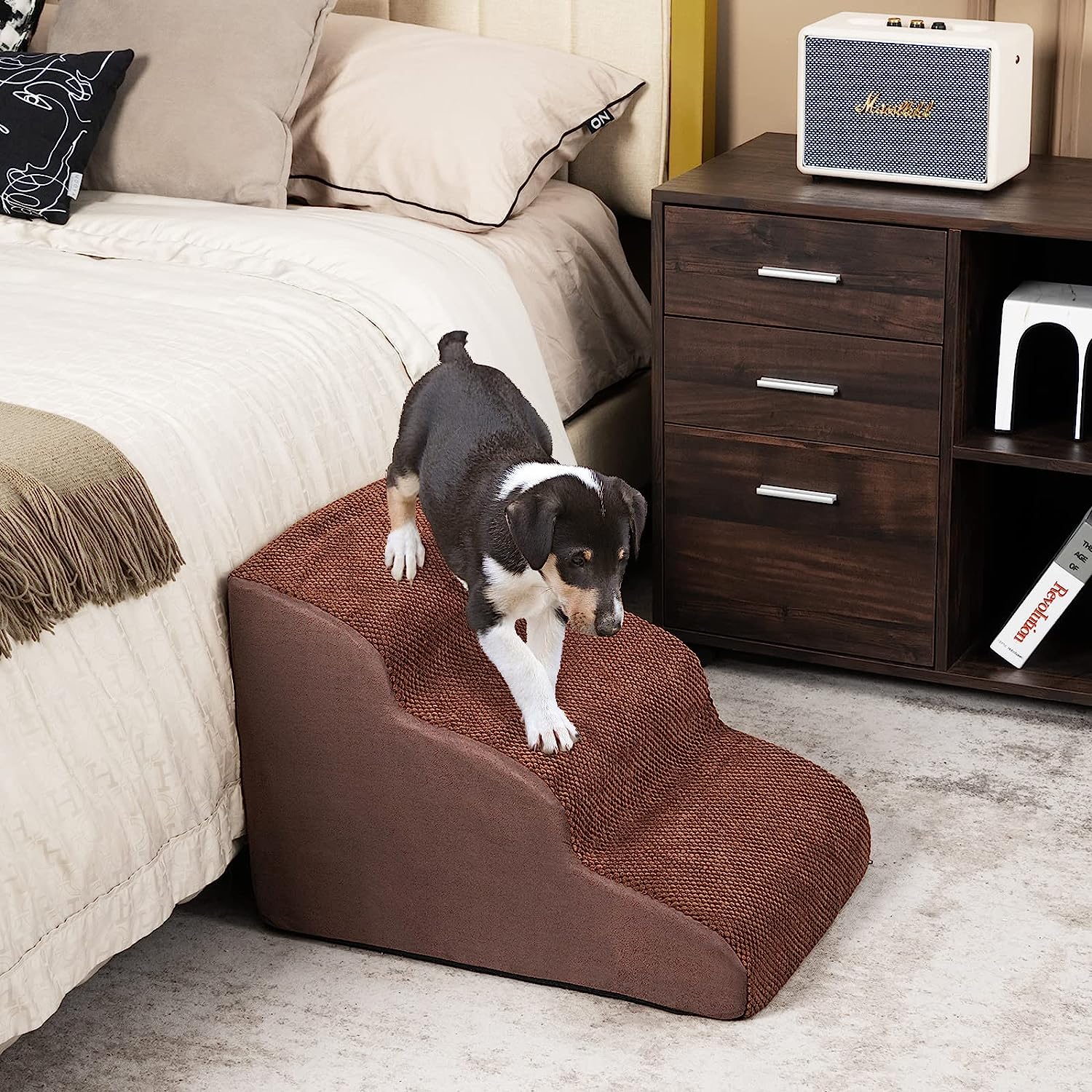 - 【Confortable et doux au toucher : 】la rampe pour chien à 3 niveaux est remplie de mousse haute densité, qui se caractérise par une grande élasticité et une grande résistance à la déformation, offrant un soutien solide et assurant une grande capacité de charge de 30 kg. De plus, la housse est en tissu suédé doux, offrant un toucher confortable tout en augmentant la friction.