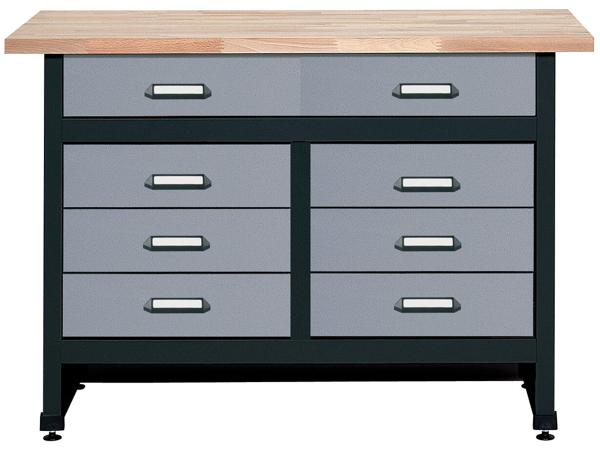 établi Küpper avec 7 tiroirs à grande ouverture, coloris gris-argenté. Tous les tiroirs disposent d'une poignée en plastique de qualité supérieure avec fenêtre pour une inscription individuelle. La capacité de charge par tiroir est de 25 kg (charge répartie). Cet établi de qualité supérieure, entièrement fabriqué en Allemagne, dispose d'un plateau massif en hêtre massif de 30 mm d'épaisseur (collé sur tige et abouté). La capacité de charge de l'établi peut atteindre 300 kg (charge répartie). Le corps est en tôle d'acier robuste et de haute qualité. Les pieds réglables en hauteur servent à compenser les irrégularités du sol et assurent ainsi une stabilité parfaite de l'établi. La livraison s'effectue à l'état démonté, dans un carton. Les instructions de montage fournies assurent un montage facile. Le fabricant accorde une garantie de 5 ans. L'article est soumis à un court délai de livraison. Le transporteur vous contactera par téléphone pour convenir d'une date de livraison.