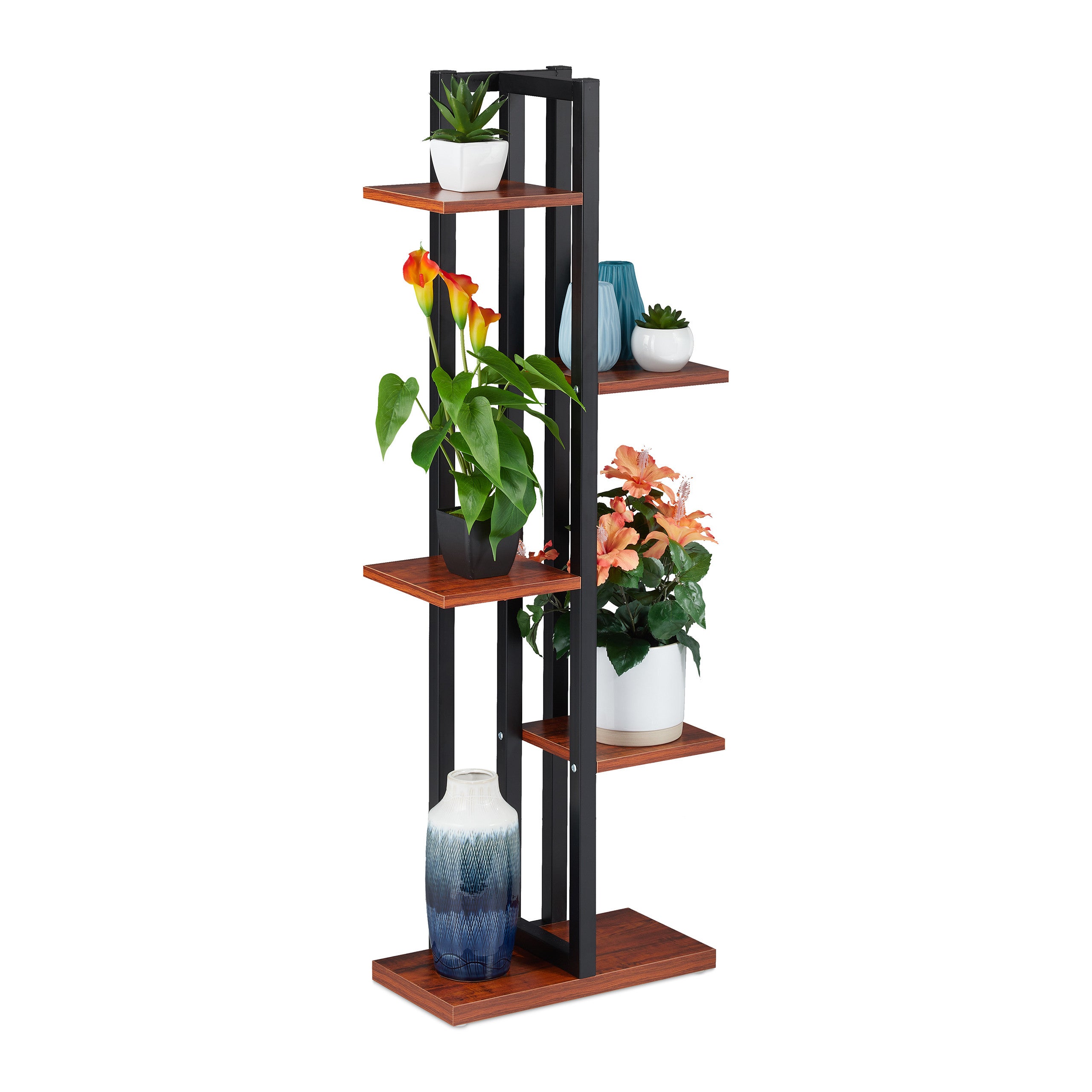 Étagère à plantes, escalier fleurs, 5 niveaux, HLP 117 x 43 x 22 cm, acier MDF, support intérieur, brun foncé, Relaxdays