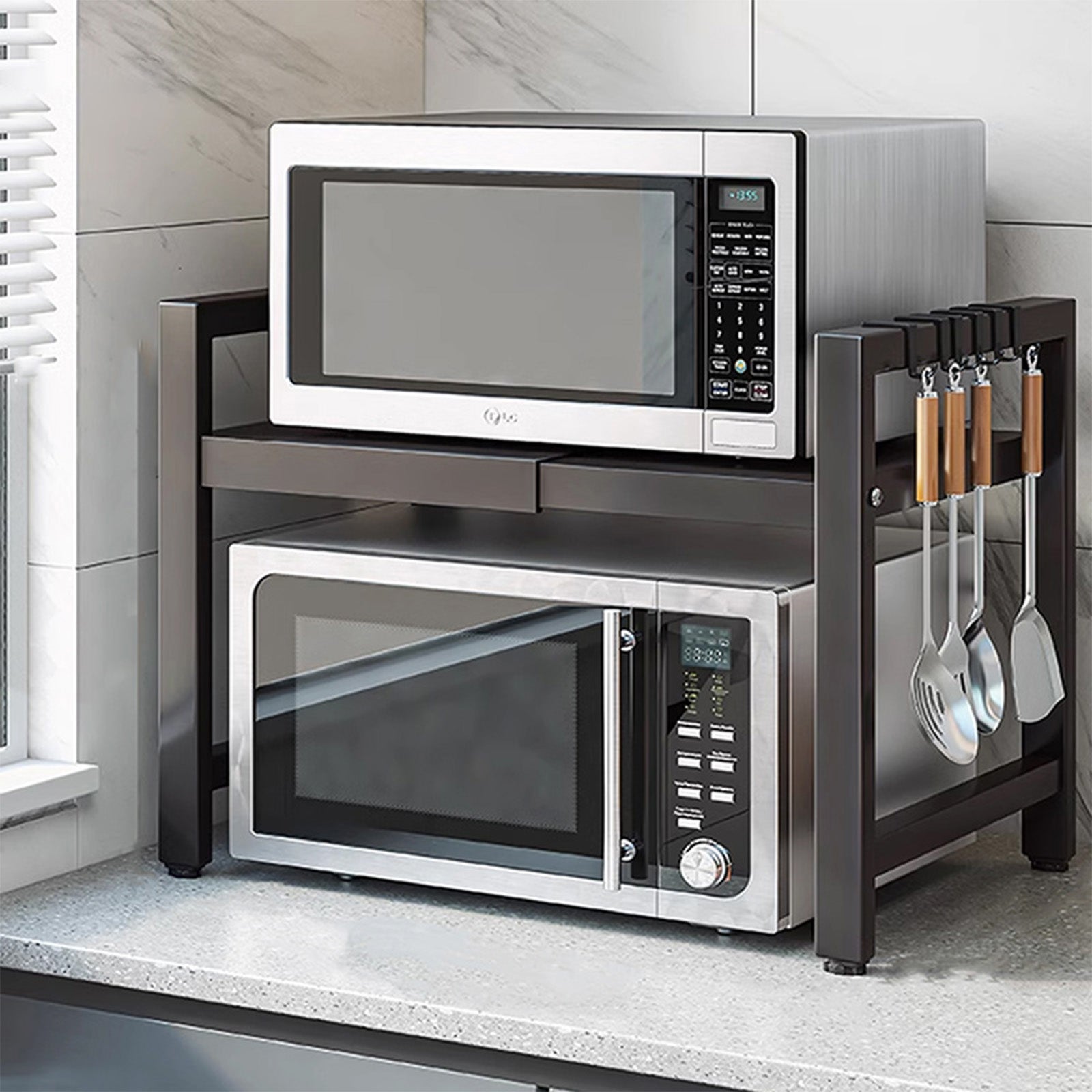 Étagère de Cuisine 2 Niveaux Structure Noireavec 6 crochets – Rangement Micro-ondes et Appareils Multifonction Renforcé - 40-64 cm