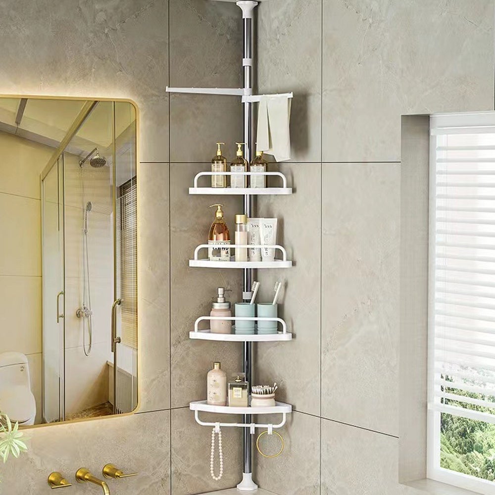 Étagère de douche d'angle en métal, réglable en hauteur, sans perçage, avec 4 paniers et 2 barres porte-serviettes pour baignoire, 95-250 cm, blanc