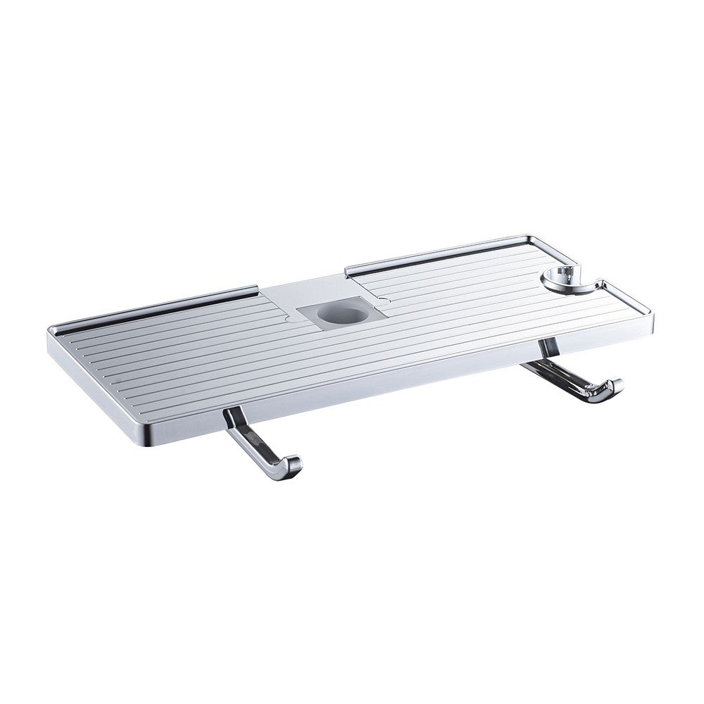 Équipé de deux crochets pour suspendre les éponges et les serviettes et d'un espace spécial pour positionner la douchette.