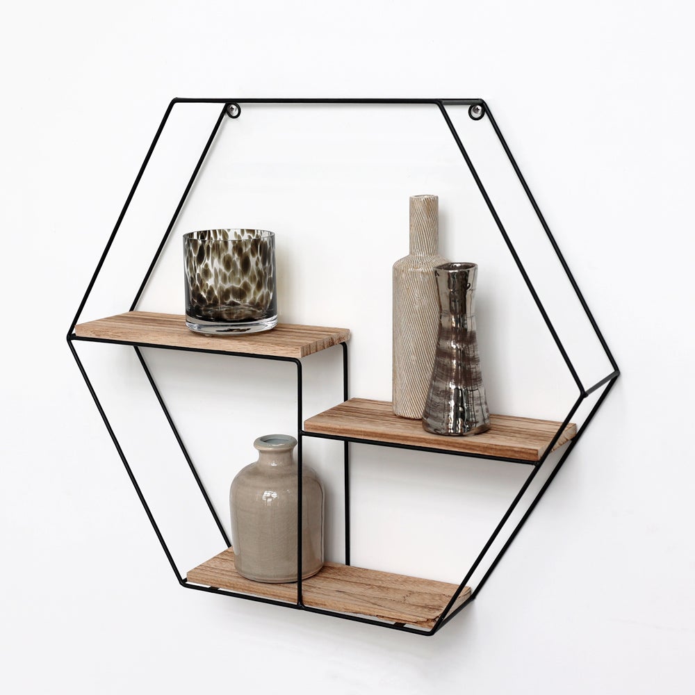 Vous recherchez une étagère mural en métal pour donner plus caractère à votre intérieur ? Les étagères murales sont la tendance du moment et vous pouvez les décorer avec vos accessoires de maison préférés. Cette étagère murale hexagonale en métal a un cadre noir mat et 3 étagères en bois.