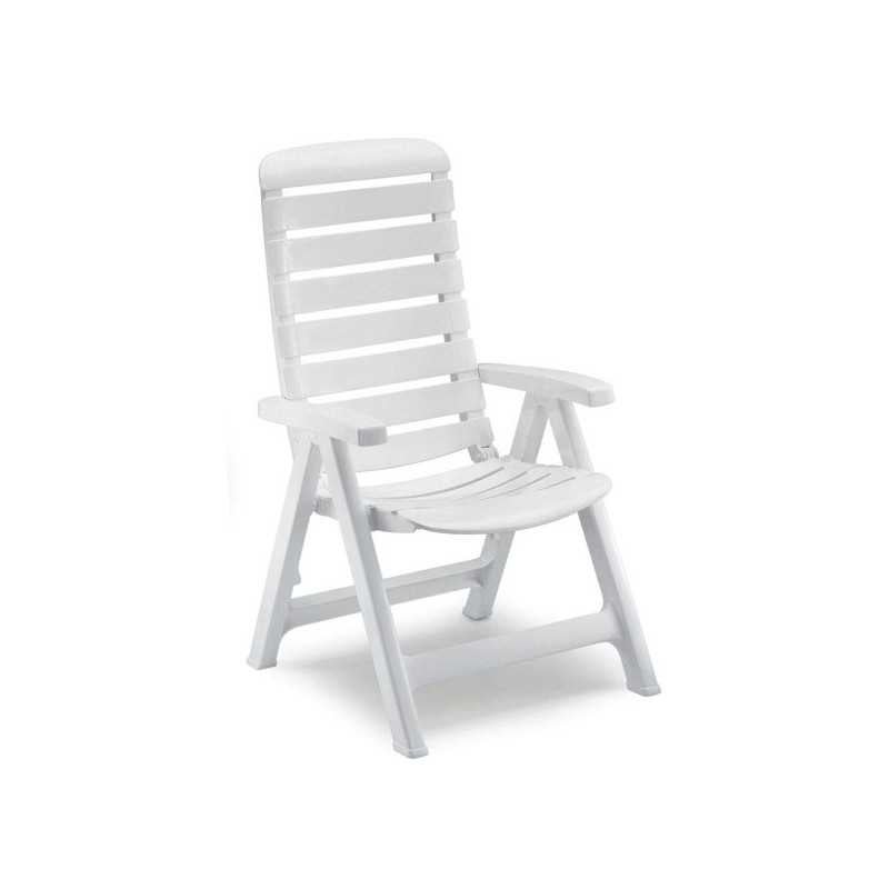 Fauteuil pliant en résine blanche de première qualité, 100% recyclable, résistante aux agents atmosphériques, à la moisissure, au smog et à la poussière. Il est équipé d'accoudoirs et d'un dossier confortable réglable sur cinq positions. Ne convient pas aux surfaces parfaitement lisses ni à un usage professionnel. Mesurant 60x67x108 cm. Modèle Cléopâtre, marque Scab
