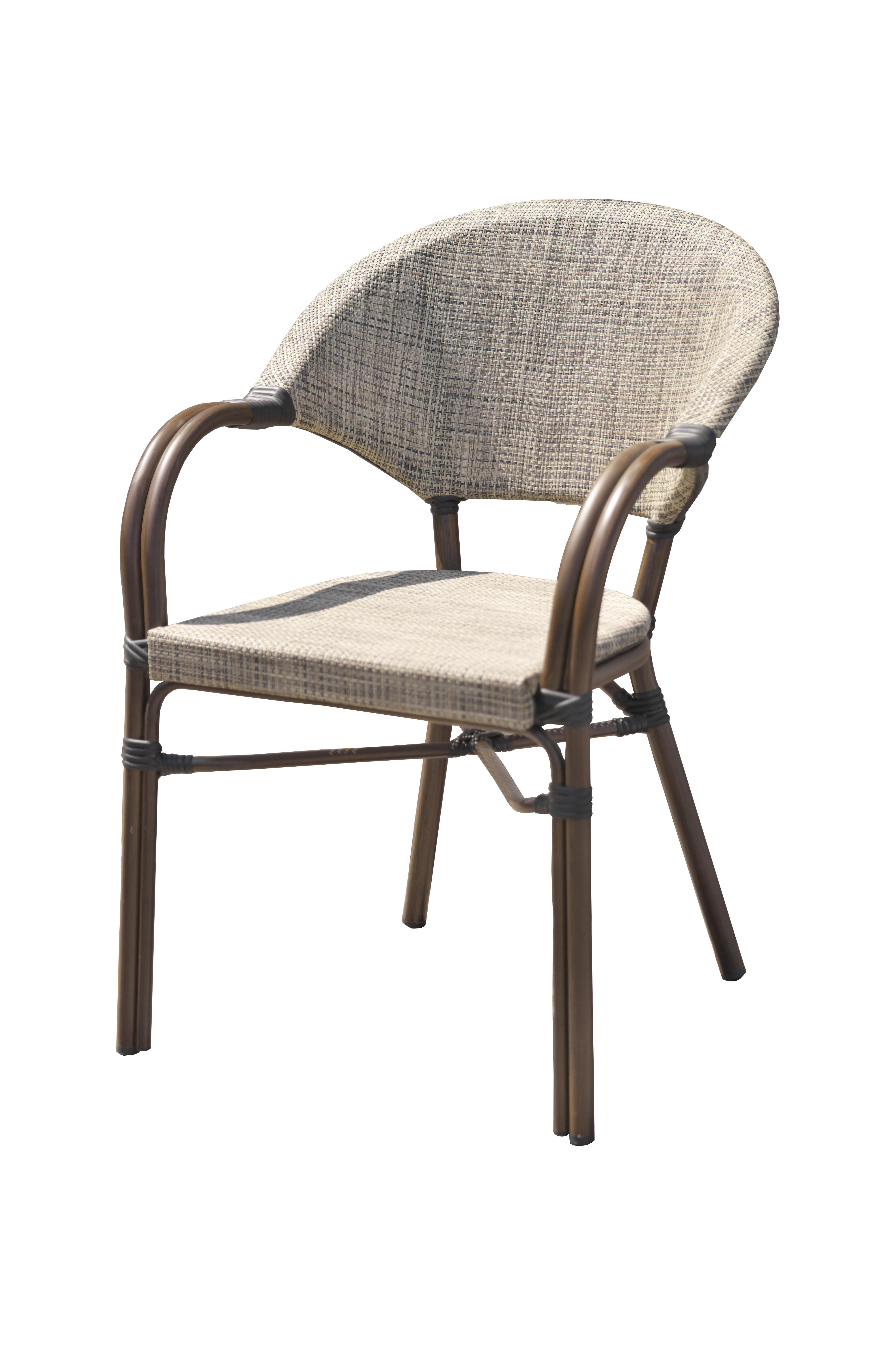 Le fauteuil de jardin USHUAIA en aluminium marron et textilène beige est empilable. Dimensions : L 56 x l 60 x H 85 cm - Hauteur sol-assise : 46,5 cm - Hauteur sol-accoudoir : 65 cm