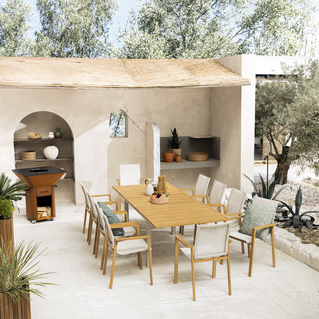 Une chaise légère et fonctionnelle La chaise Odyssea Gamma est l'allié idéal de vos moments conviviaux en extérieur. Cette chaise de jardin allie confort et modernité avec son assise en textilène qui épouse les formes de votre corps, et sa structure en aluminium. Légère et munie d'accoudoirs, cette chaise en aluminium est empilable, facile à déplacer et à ranger. Sa conception lui assure une résistance aux variations climatiques. Elle ne craint pas l’humidité, ni la rouille. Un esprit chaleureux sur votre terrasse Avec son assise beige et sa finition imitation bois, la chaise Odyssea gamma apporte un esprit chaleureux et doux à votre extérieur. L'effet bois confère à l'ensemble une touche naturelle, sans les contraintes d'entretien du bois naturel. Coordonnez-la avec la table Odyssea effet bois pour composer un ensemble repas harmonieux et accueillant, idéal pour vos repas en famille ou entre amis. Conseils d'entretien Conçue en aluminium et textilène, cette chaise résiste aux intempéries et sèche rapidement, rendant son entretien minimal. Un chiffon humide et un produit neutre suffisent à la nettoyer. Veillez à couvrir le produit d'une housse lorsqu'il n'est pas utilisé, pour le protéger des salissures et des intempéries.