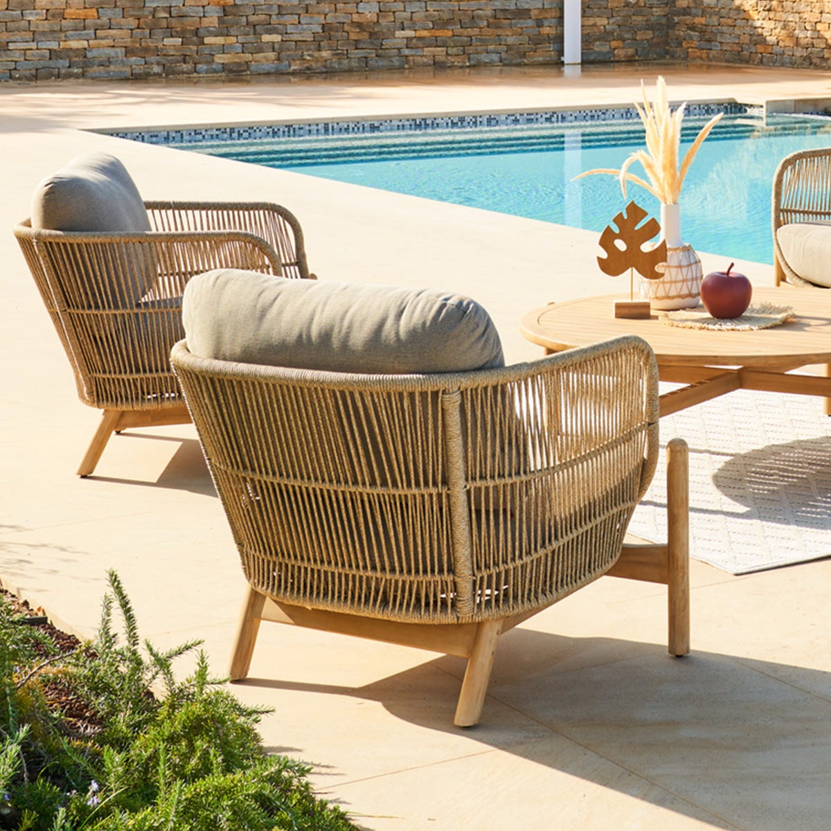Le fauteuil de jardin "DEONA" possède une structure avec un effet corde tressée et des pieds en bois d'acacia.