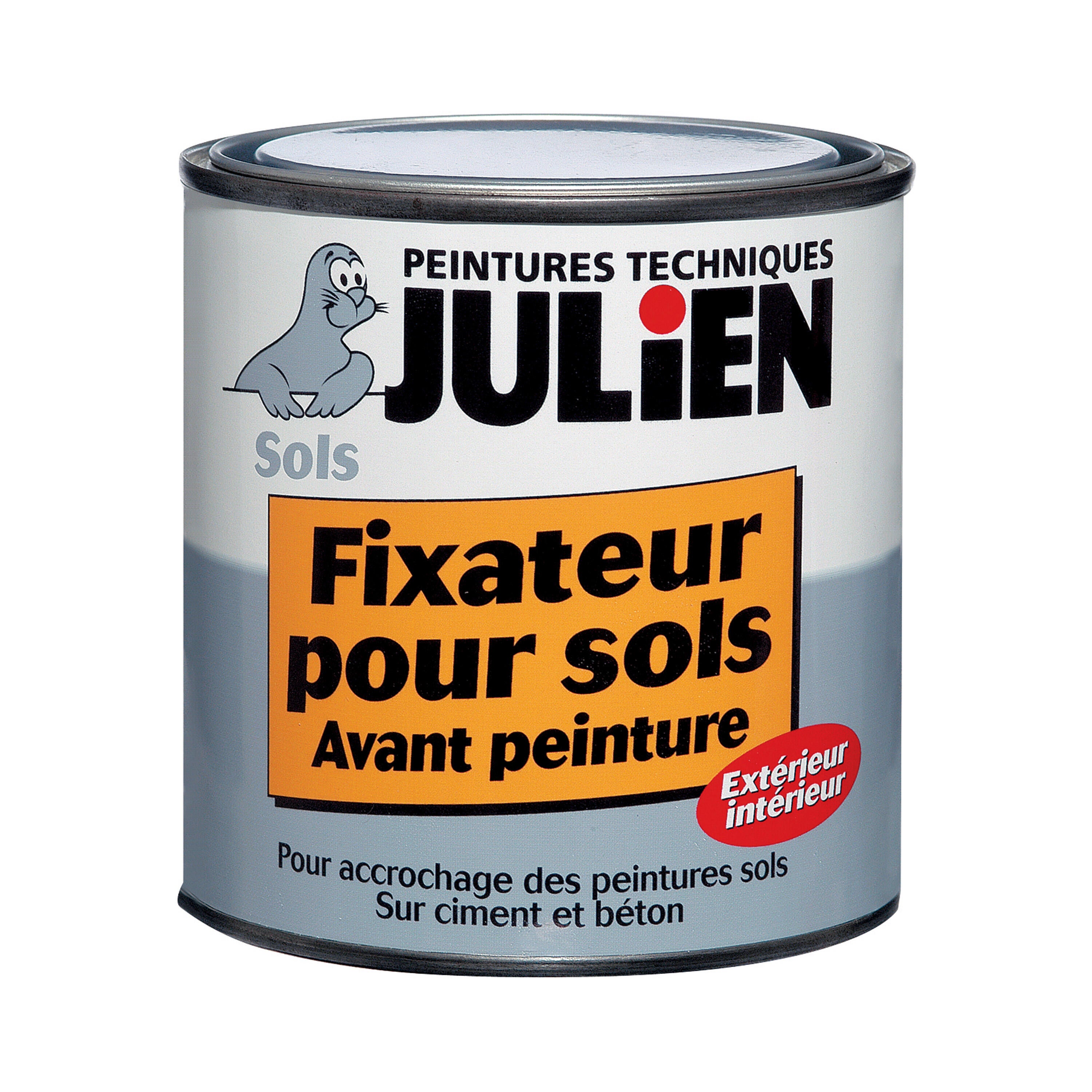 Le fixateur en phase aqueuse Julien est destiné à restructurer les sols farinants et permettre une excellente adhérence des peintures sols. Assure une excellente tenue de la finition dans le temps. Renforce les sols peu cohésifs ; ciment, béton, carreaux ciment, terres cuites poreuses, à l'intérieur comme à l'extérieur. Il permet de repeindre sans ragréage un sol ancien. Recouvrable rapidement en 2 heures par toutes les peintures sols : alkyde modifié, acrylique, bi-composante, etc. Conseils d'application : S'applique à la brosse ""spéciale peinture à l'eau"" ou au rouleau à poils 10-12mm. Pour une bonne efficacité, il est indispensable d'appliquer jusqu'à saturation, identifiable quand un voile fin laiteux reste en surface. Un léger tack (sensation collante) est normale et apparait après séchage. Ne pas appliquer sur d'anciennes peintures. Sur support peu absorbant, il est nécessaire de diluer le produit à 20% d'eau. Ne jamais appliquer sur ciment bouchardé. Incolore à l'application, le fixateur pour sol doit obligatoirement être recouvert. La mise en peinture est réalisable à partir de 2h sans dépasser 48 à 72 heures, car un risque d'encrassement est possible du fait de son léger tack.