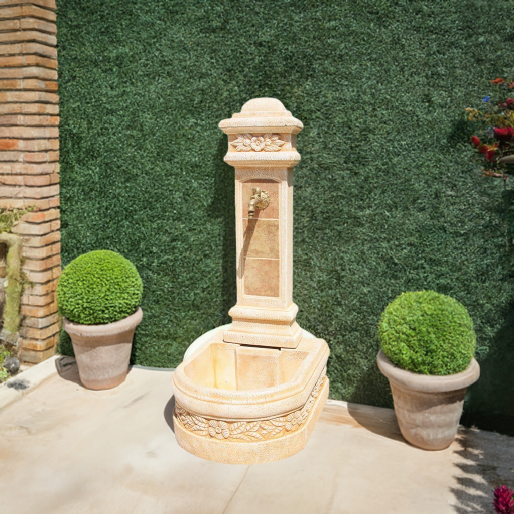 Fontaine de jardin, pour l´extérieur, réalisée en pierre reconstituée également appelée béton, à base de ciment blanc et de granulats de marbre. Couleurs garanties contre les intempéries, dues à des températures extrêmes, ainsi que l´humidité ou les rayons UV. Dimensions extérieures: 53X62X122cm. (largeur x profondeur x hauteur). Couleur de la pierre: Ocre. Matériau: Pierre reconstitué. // Poids de l´article: 128 Kg. Robinet inclus. Les commandes de plus de 30 kg de poids total seront livrées au niveau de la rue. La fontaine est préparée sur palette, cerclée et emballée, démontée pour faciliter la manutention. Fabriqué en ESPAGNE.