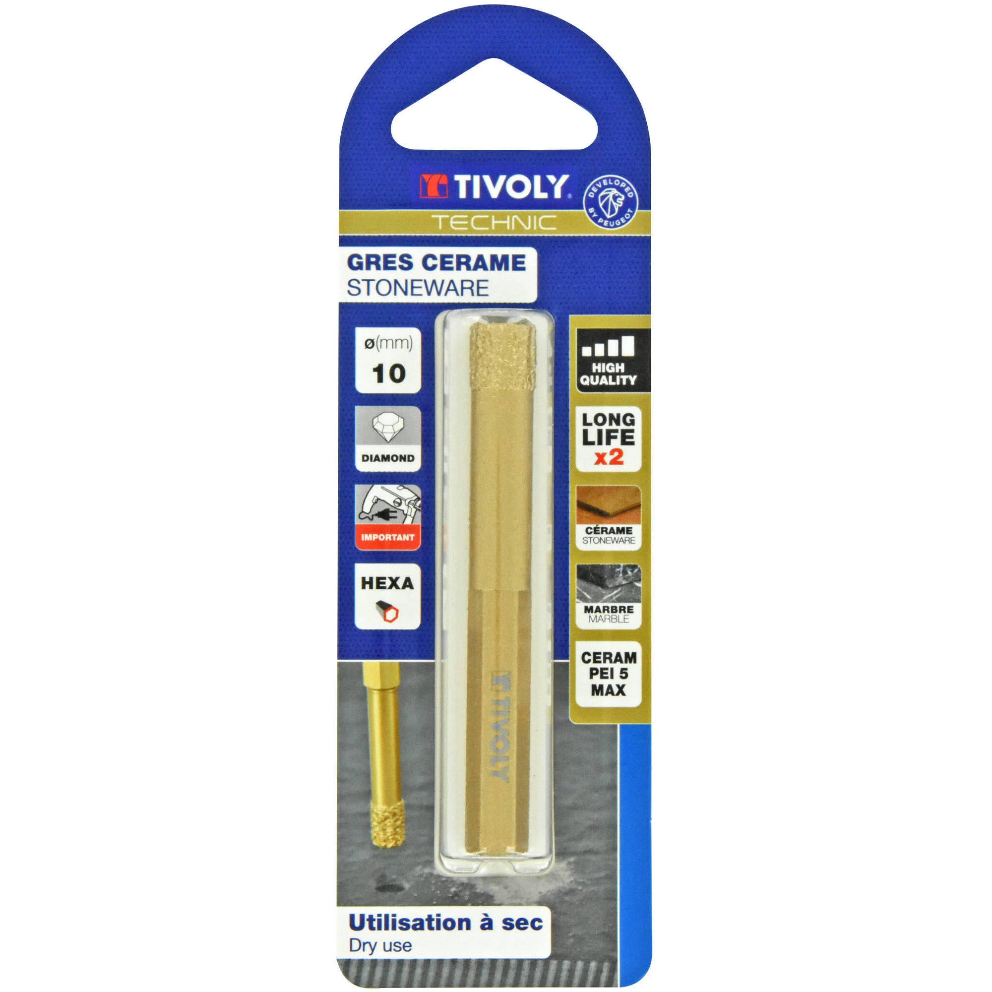 Utiliser à sec. Perçage rapide (2200 tr/mn) et précis de matériaux résistants, type GRES CERAM, CARRELAGE classe IV-V.