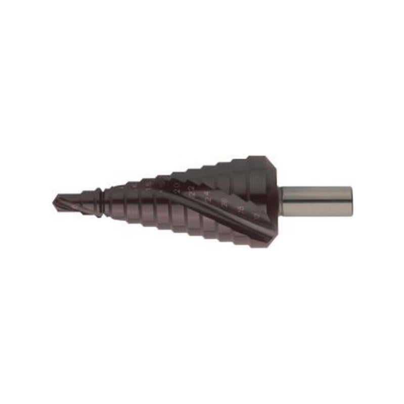 Foret étagé universel à goujure hélicoïdale, revêtement TiAIN Longueur de l'étage : 6 (avant-trou) - 3 (trou débouchant) mm, Longueur totale 96 mm, Ø de la queue h8 : 12 mm - Norme d'usine - Acier à coupe rapide - Marquage au laser des Ø du trou et des vitesses de rotation - 2 arêtes de coupe - Brise-arêtes - Goujure hélicoïdale - Une queue à 3 faces empêche un patinage de l'outil dans le mandrin - Affûtage en croix Remarque : nous vous recommandons l'utilisation de la pâte de forage afin d'augmenter la longévité (réf. 42 12004 200).