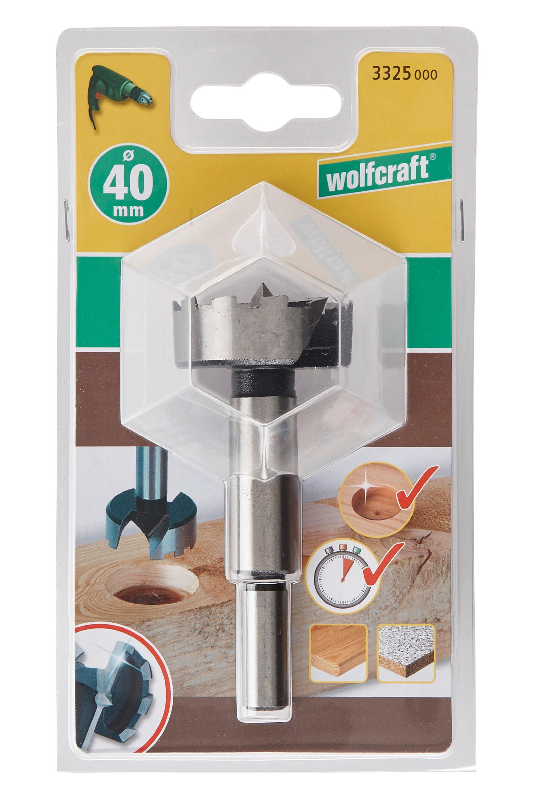 1 fraise d‘encastrement CV longueur 90 mm ø 40 mm queue ø 10 mm Pour perceuses Pour bois tendres, panneaux d'agglomérés plaqués et plastique Pour percer des trous aux bords nets, précis et aux dimensions prévues Avec pointe de centrage 2 tranchants principaux Tranchants périphériques crénélés Géométrie spéciale des tranchants = temps de perçage plus courts = pas de traces de brûlure dans le bois Le perçage demande moins de force physique = ménage la machine Efficace grâce à la qualité de coupe de la fraise à denture intégrée Finition parfaite grâce à la géométrie anti-chauffe de la fraise qui ne laisse aucune brûlure même sur bois dur Fraise de très haute qualité anti-chauffe Facile d’emploi grâce au guide de pose pour perçage ø 26 ou 35 mm avec perforations pour marquer les points de perçage symétriques