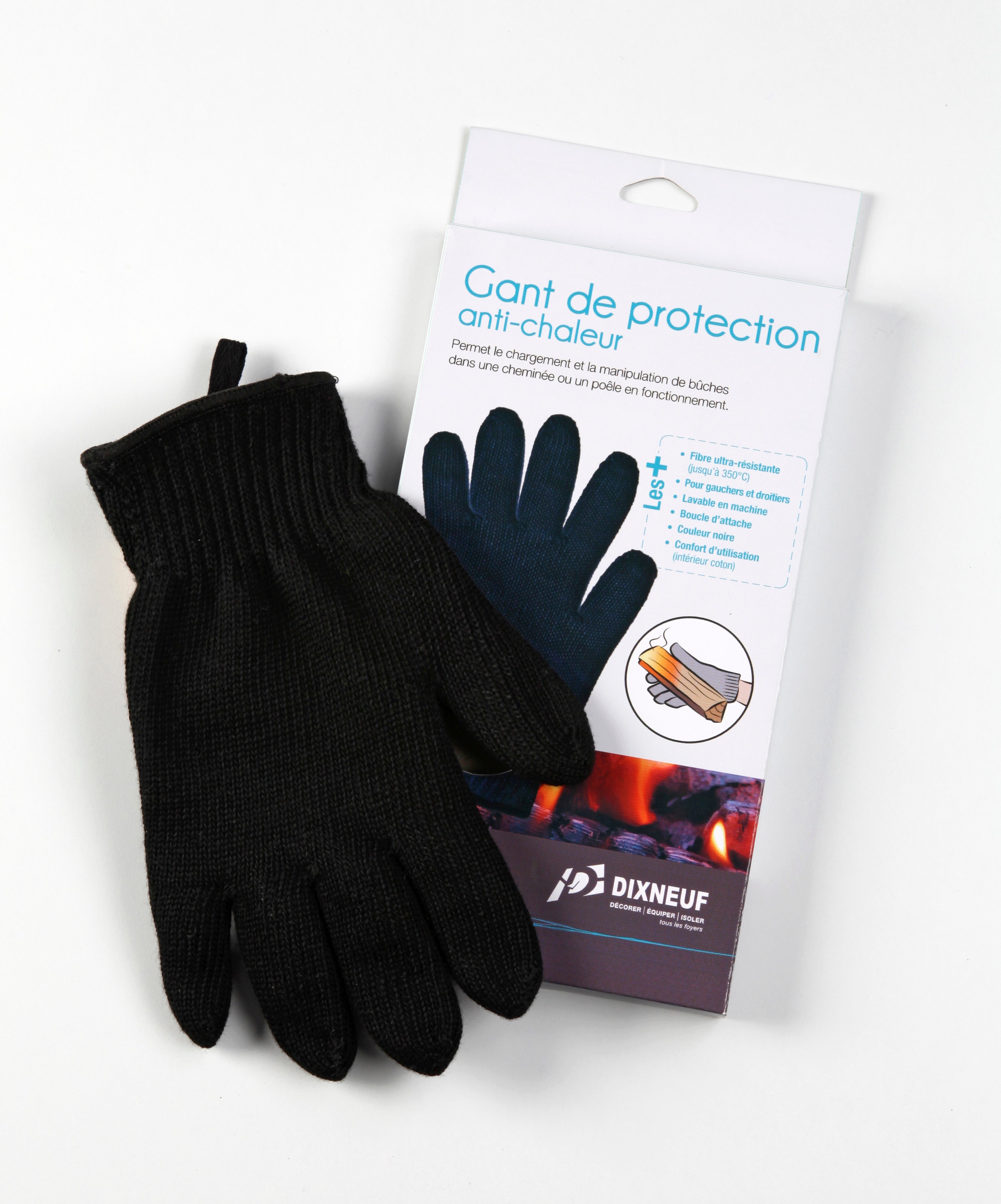 Gant de protection antichaleur. Il permet le chargement et la manipulation de bûches dans une cheminée ou un poêle en fonctionnement. Composé d'une fibre ultra-résistante : jusqu'à 250°C, intérieur en coton. Pour gauchers et droitiers. Lavable en machine jusqu'à 40°C. Boucle d'attache pour un meilleur maintien et une meilleure sécurité. Couleur : noir.