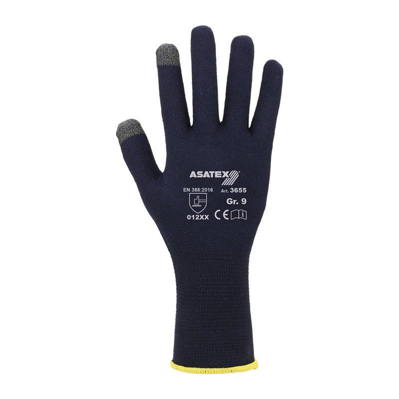 selon LA 388 · Kat. II · Matériel : Coton, Élasthanne · avec un point de point antidérapant · tricots sans soudure · Pouce et index avec fonction tactile · convient pour les écrans tactiles et les smartphones · Application : Entrepôt et logistique, Service, Transport Autres caractéristiques techniques : · Résistance à l'abrasion : 0 · Résistance à la résistance à la résistance à la corrosion: 2 · Résistance à la piqûre: X · Résistance à la coupe (essai de coupe) : 1 · Exécution : avec un point de point antidérapant · Norme : EN 388. Couleur: bleu foncé, Taille: 8, Marque: ASATEX, Matériau: matériau : coton / élasthanne, Catégorie EPI: II. Couleur: bleu foncé, Taille: 8, Marque: ASATEX, Matériau: matériau : coton / élasthanne, Catégorie EPI: II