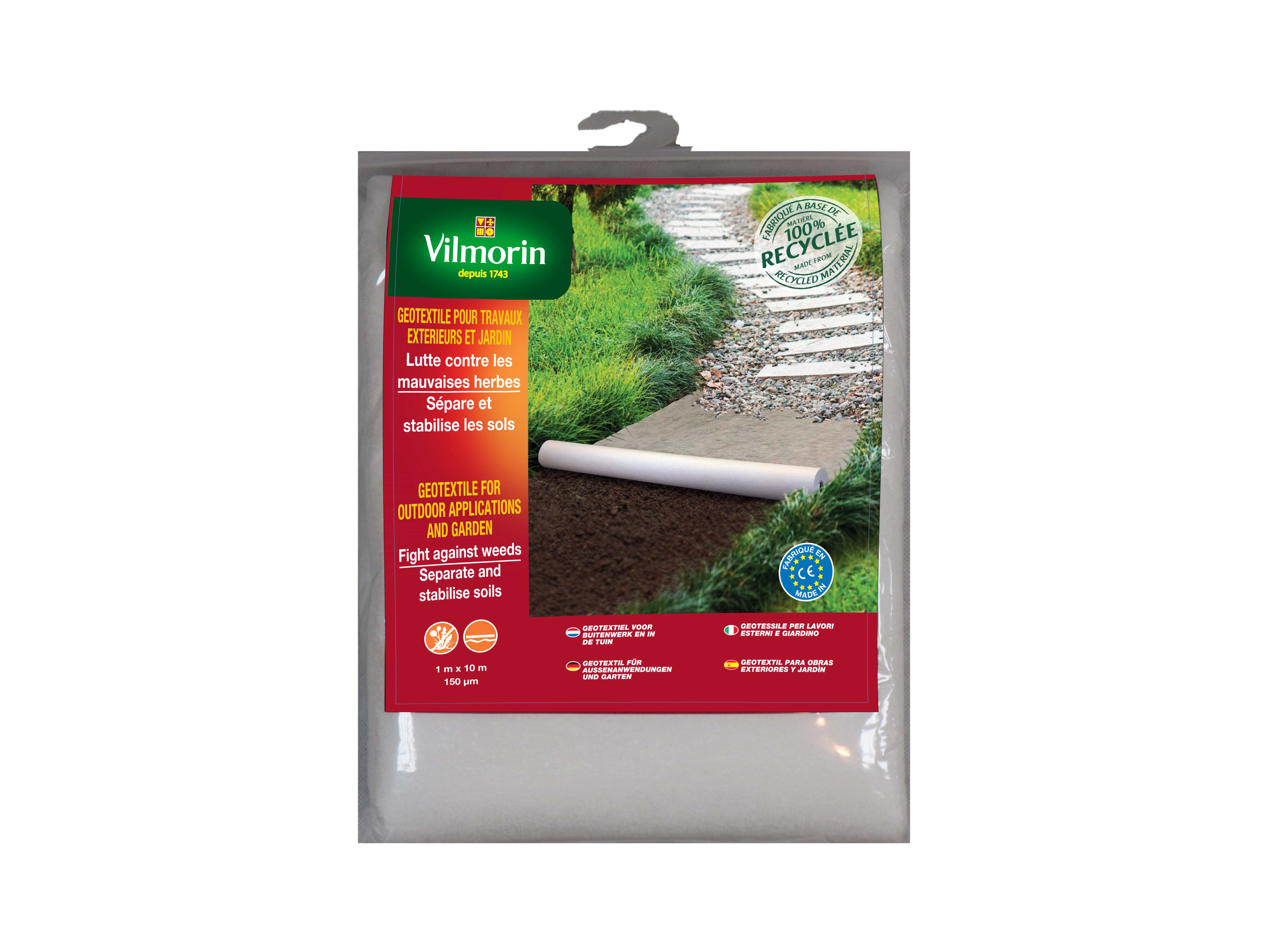 Ce film géotextile est un feutre composé de fibres Polyéthylène issu de plastique 100% recyclé. Ce tissu permet la séparation de deux sols, la fibration des fluides, le drainage des eaux, la protection des matériaux ainsi que la lutte contre l'érosion des surfaces et des mauvaises herbes. Le film géotextile s'utilise très bien au jardin lors de la création de terrasses, d'allées ou de bassins.
