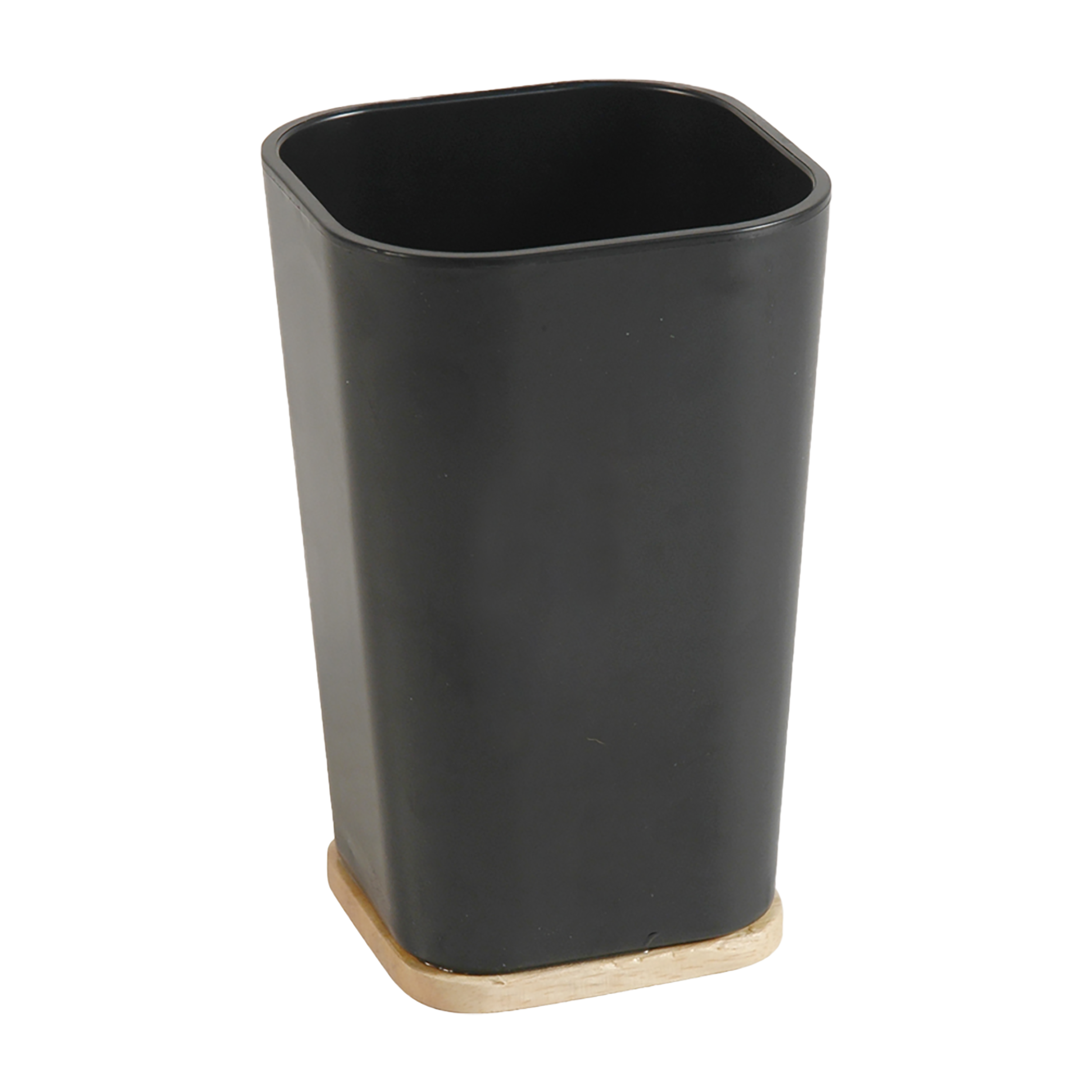 Gobelet de salle de bain Sensea Scandi en bois noir brillant et plastique. De forme carrée, il est conçu pour être posé sur un plan de travail ou un évier et ainsi y placer des brosses à dents à l'intérieur. Disponible en blanc. Dimensions : 7,3 x 10,5 x 7,3 cm (largeur x hauteur x longueur).