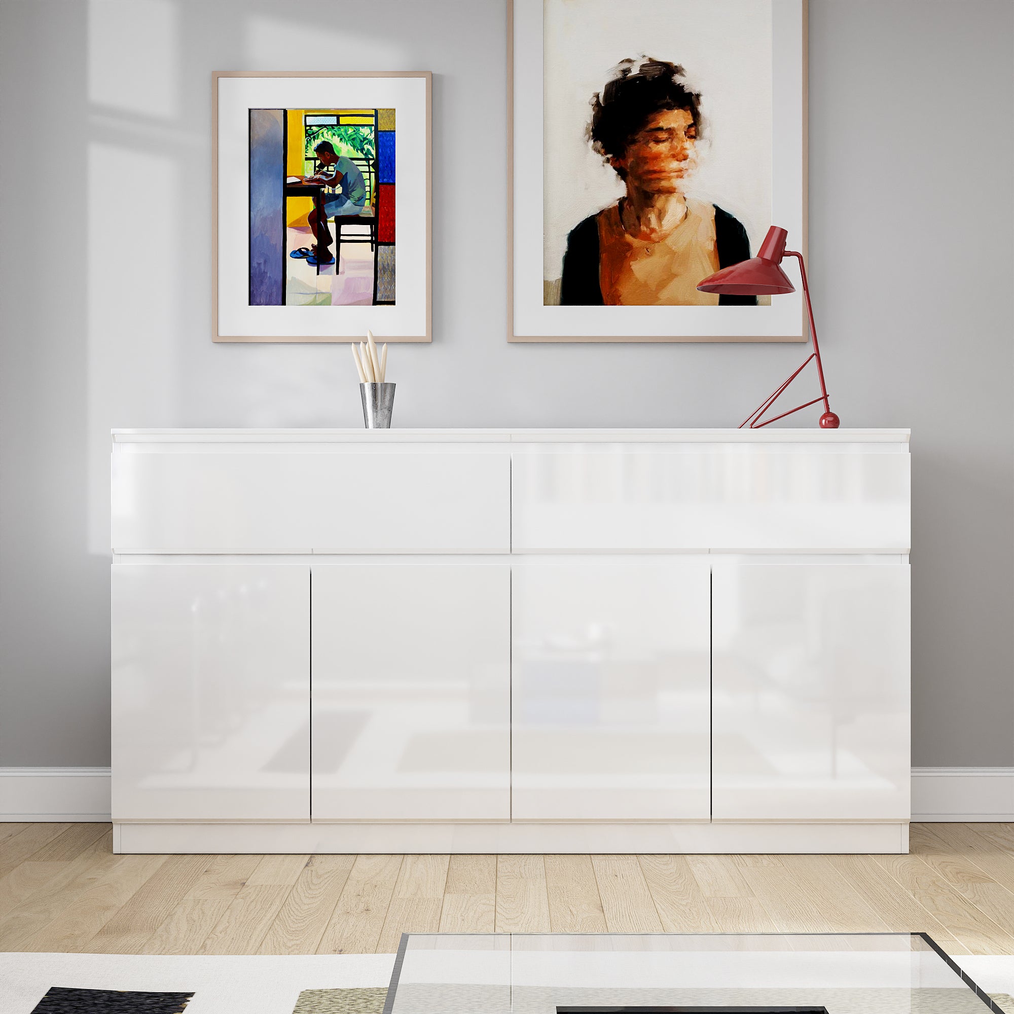 Grand Buffet de Salon avec 4 Portes et 2 Tiroirs, Rangement de Chambre sans Poignée, 155 x 40 x 83, Blanc Brillant