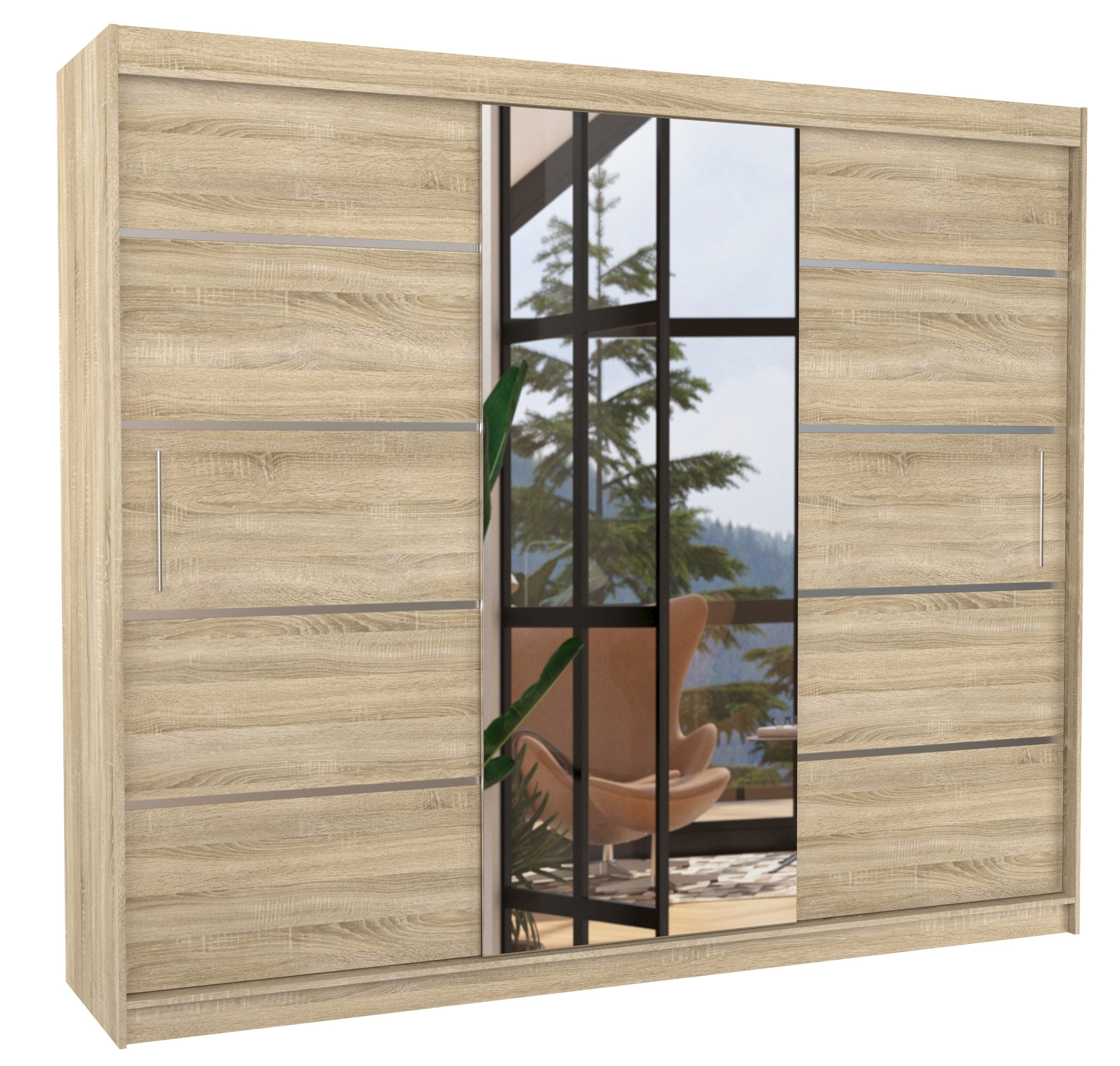 Grande armoire de chambre à coucher 3 portes coulissantes naturel et alu avec miroir Cindy 250cm