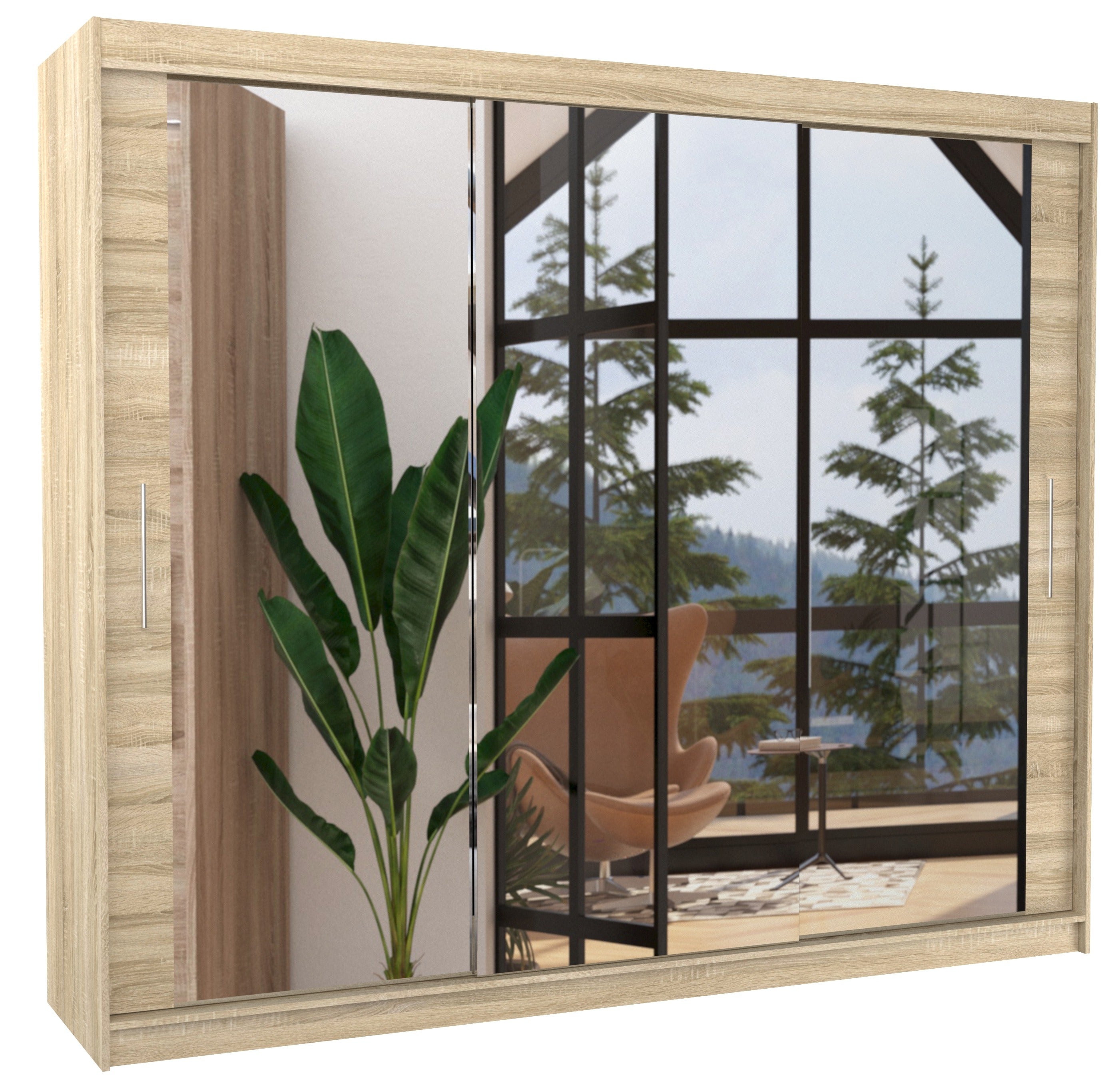 Grande armoire de chambre moderne 3 portes coulissantes bois clair et miroir Douko 250cm