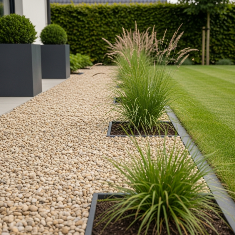 - Gravier Décoratif pour massifs, parterres et plate bandes au jardin (après la pose d'un géotextile pour limiter la repousse des mauvaises herbes)