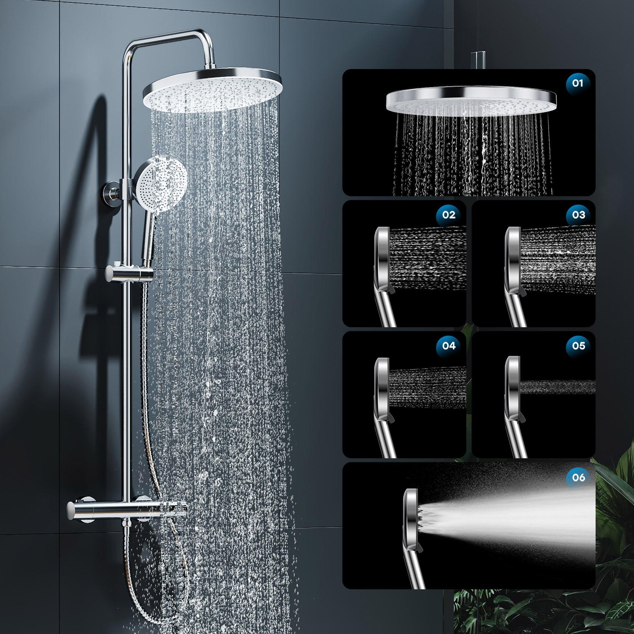 ★ Zone de douche plus large : Une douche de tête ronde de 30 cm et une douchette de 13 cm offrent une couverture optimale. La douchette propose 5 jets différents pour une expérience de douche personnalisée et confortable.