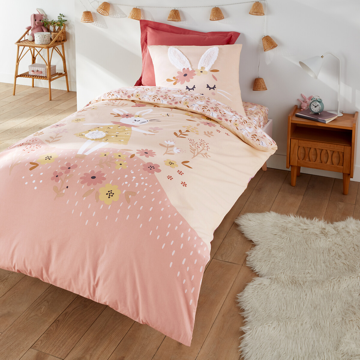 Housse de couette coton biologique, Lapin fleuri - Imprimé rose - 140 x 200 cm