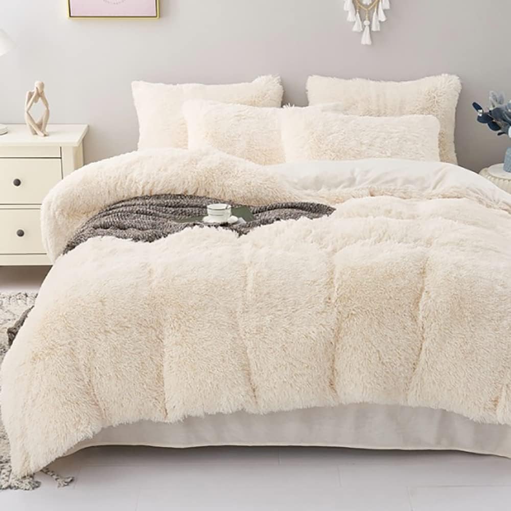 Housse de Couette Peluche 220x240 + 2 Taies 65x65cm - Blanc Crème