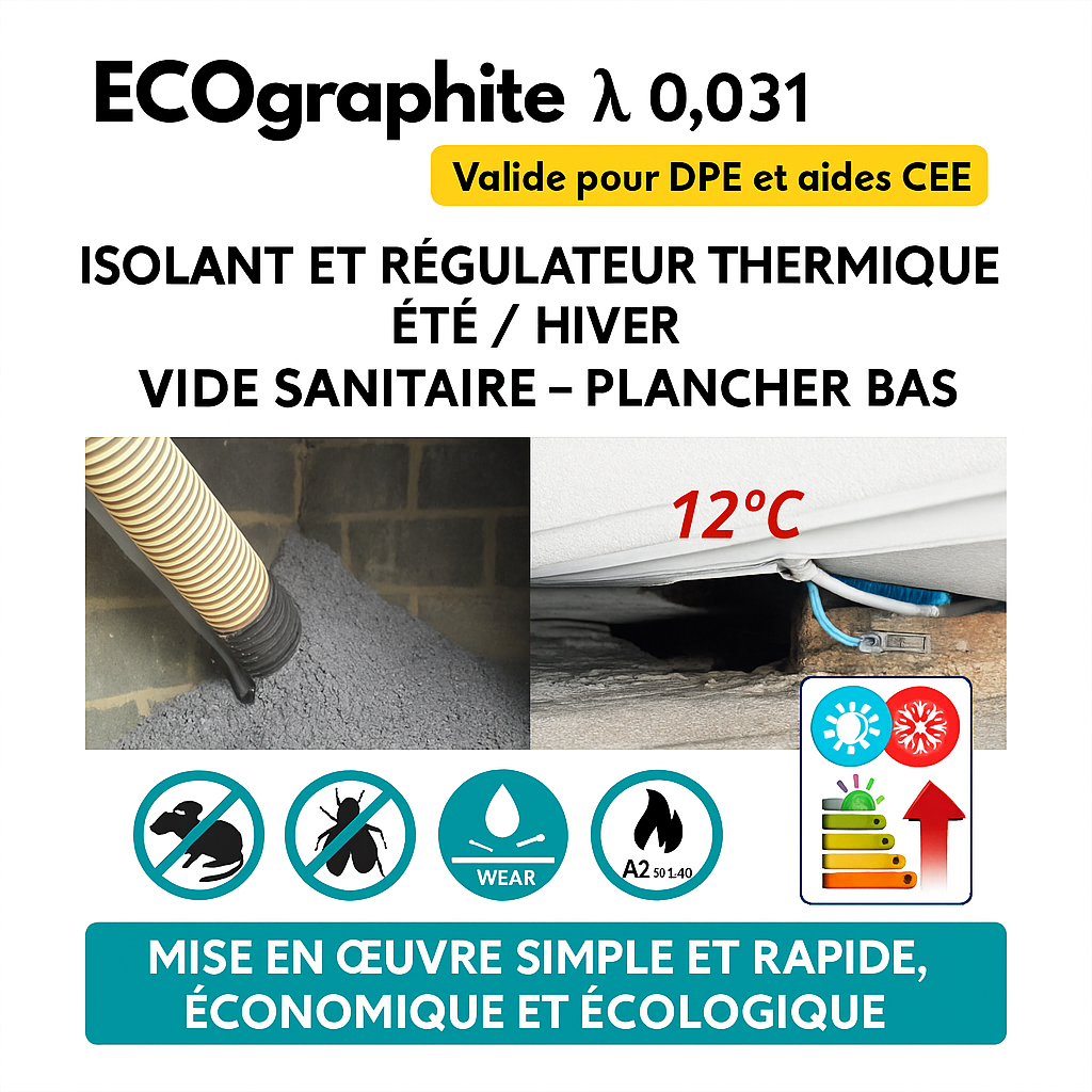 ✅ UNIQUE SUPER- ISOLANT VRAC VALIDE POUR DPE, {SANS OBLIGATION DE MISE EN ŒUVRE PAR UN PROFESSIONNEL sous AT avec liant, ou membrane étanchéité a l’air coté interieur} – car ECOGRAPHITE λ 0,031 est EXEMPT de POLLUANT (STYRENE-PENTANE, IGNIFUGEANT, PESTICIDE ANTIMOISSISURES, FIBRES) ✅ ECOGRAPHITE λ 0,031 est ainsi VALIDE pour des usages aussi exigeants que : Coussins d’allaitement en hôpital (certifié OEKO-TEX & TOXPROOF, la scénographie dans toute l’Europe, et le béton industriel ✅Contrairement à la bille de polystyréne graphite ou non, pas d'obligation d'utilisé un liant pour réduire le risque d’arc electrique, ou d’auto-inflammation, (résultant de l’électro-statisme du styrene en présence de Pentane (son gaz d’expansion)) et la diffusion des polluants permanent dans l'air intérieur , (exemples: styrene-Pentane, Pesticide, ignifugeants ou fibres tous classés Cancerigene Mutagène et reprotoxique par l’OMS)✅ La mise en œuvre de l’ECOGRAPHITE 0.031 est traditionnelle : ON VERSE OU INJECTE ET C’EST FINI 👉ULTRA SIMPLE et RAPIDE 👉• Avec un coefficient d’écoulement exceptionnel, sa mémoire de forme et son faible électro-statisme il peut etre mis en place par déversement ou injection ✅ ECOGRAPHITE -0.031 USAGE isolation Thermo-acoustique de toute cavité: murs creux, planchers entre lambourdes, combles ou vide sanitaire ✅ ECOGRAPHITE-0.031 met fin à L’INCONFORT DES ECHANGES THERMIQUES DES PAROIS INTÉRIEURES AVEC L’AIR EXTERIEUR, sans risque de pollution de l’air intérieur ✅ Mis au point en SUISSE, toujours en avance sur la réglementation technique et qualité de l’air 🚀 • ✅ ECOGRAPHITE-0.031 PERFORMANCES THERMIQUE : λ 0,031. R= epaisseur/ λ et , et Rth Calculé selon exigences pour DPE et aides CEE) ( loi du 10 décembre 2021 • ✅ ECOGRAPHITE 0.031 ACOUSTIQUE sa forme polymorphe autobloquante Reduit de plus de 75 % le flux d’air et les bruits extérieurs (jusqu’à –30 dB) et intérieurs (–58 dB selon configuration). 👉 ✅ ECOGRAPHITE -0.031 : 16 kg/1000 litres, granulométrie de 1 à 4 mm, ; ✅ RESISTANT au feu M1 (Euroclasse B1 S1d0), à l’eau (moisissures et champignons), aux rongeurs, au tassement etc. • 👉 ✅ Déphasage: 6 h en 20 cm• 👉 ✅ ECOGRAPHITE-0.031 Matière première d’origine contrôlé disposant des FDES d’usine certifiées tracking de l’usine a la livraison chez vous par et marquage du produit • Conforme au plan « Ma santé, mon environnement » (PNSE 4 – 2021-2025) sur la qualité de l’air intérieur et à la RE 2020. 👉•1- Marquage CE conforme aux exigences de la directive EN12163 :2008 Annexe ZA (isolants thermiques-parois opaques) 👉•2-Etiquetage conforme exigences de l’article R221.23 du Code de l’environnement (1/9/2023) 👉•3-Fiches BAR et BAT selon exigences de la loi du 10 decembre 2021 👉•4-Fiche de Sécurité conforme aux exigences du reglement CE n°1907/2006 transmise aux utilisateurs selon Art R4411-73 du code du Travail ⚠️ (1.2.3.4) Elements obligatoires associés avec la facture et le bon de livraison, pour le « Cahier d’information logement » (CIL), exigence de la loi du 30 décembre 2022 afin • D’Informer tout acquéreur ou locataire 👉a) sur l’usage de produits à risques révélés par l’OMS sur la santé dans l’habitation, 👉b) sur la conformité des isolants et les conditions de mise en œuvre. • 👉De réaliser le diagnostic thermique DPE sur les performances des isolants utilisés. ✅ Achetez en toute confiance SUR LES MARKETPLACES INTERNATIONNALES AVEC des garanties légales étendus avec la garantie vice cachés • des avis vérifiés et fiable • ou directement à Biounitech SA • ⚠️ Attention aux faux distributeurs ECOGRAPHITE et petits sites d’arnaque en ligne de performances thermiques non certifies, ou avec avis technique restreints à l’usage par entreprise agrée, avec liant ,et pour des emplois trés limités! 👉 ✅ Presentation sacs de 500 litres (soit 8 kg) ; consommation 10 litres/cm d’épaisseur et / m2 👉 ✅ Besoin d’un CALCUL VOLUME ou ISOLATION, DOCUMENTATION, CONSEILS Tel 06 65 12 46 06