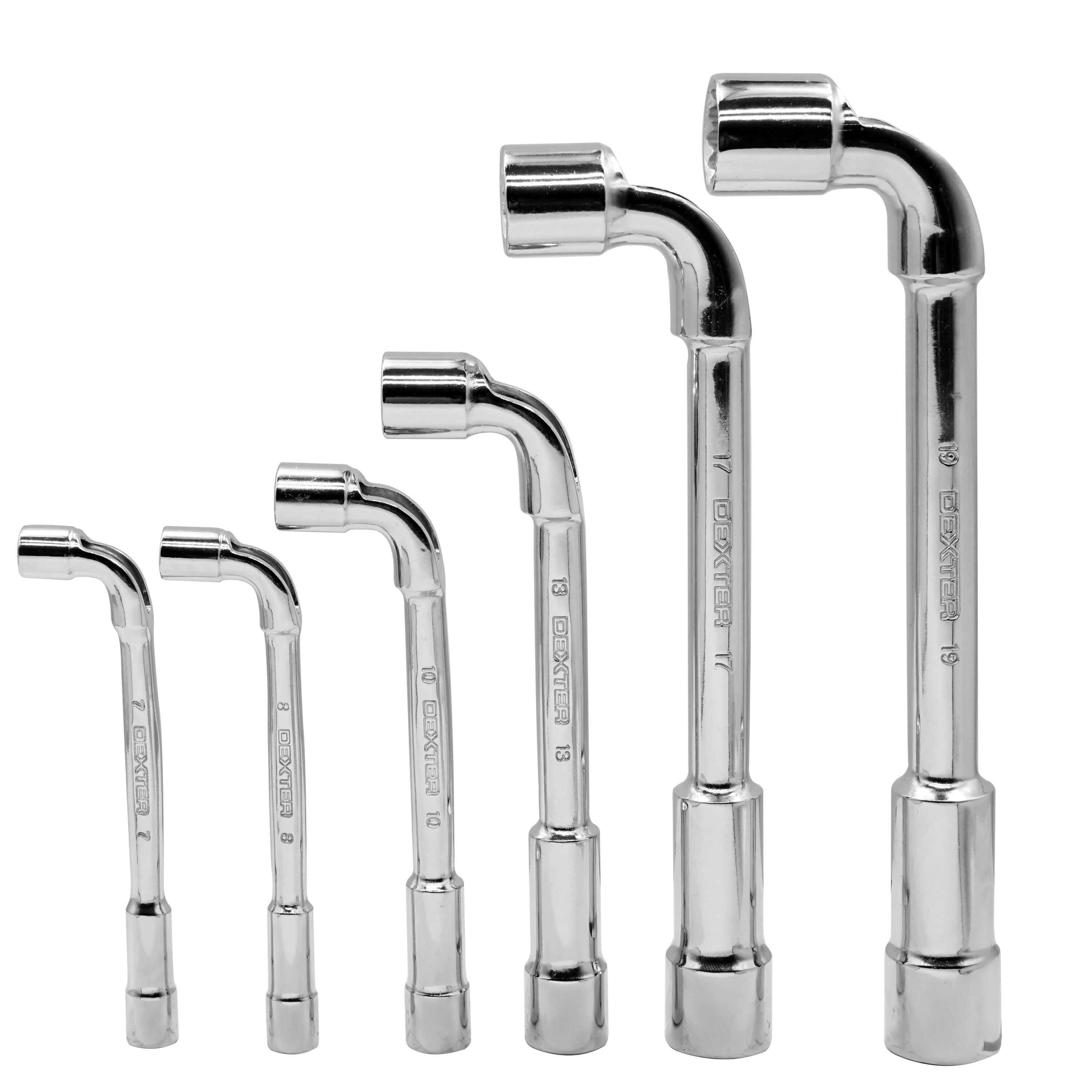 Set de clés à pipe DEXTER contenant 6 pièces : 7, 8, 10, 13, 17 et 19mm, idéal pour serrer/desserrer des écrous encastrés, des boulons ou sur une tige filetée.Le profil coudé a été pensé avec un orifice permettant de serrer un écrou sur une tige filetée sans limite de profondeur. Le profil droit favorise l'accès aux écrous encastrés. L'acier chrome vanadium apporte une grande résistance.