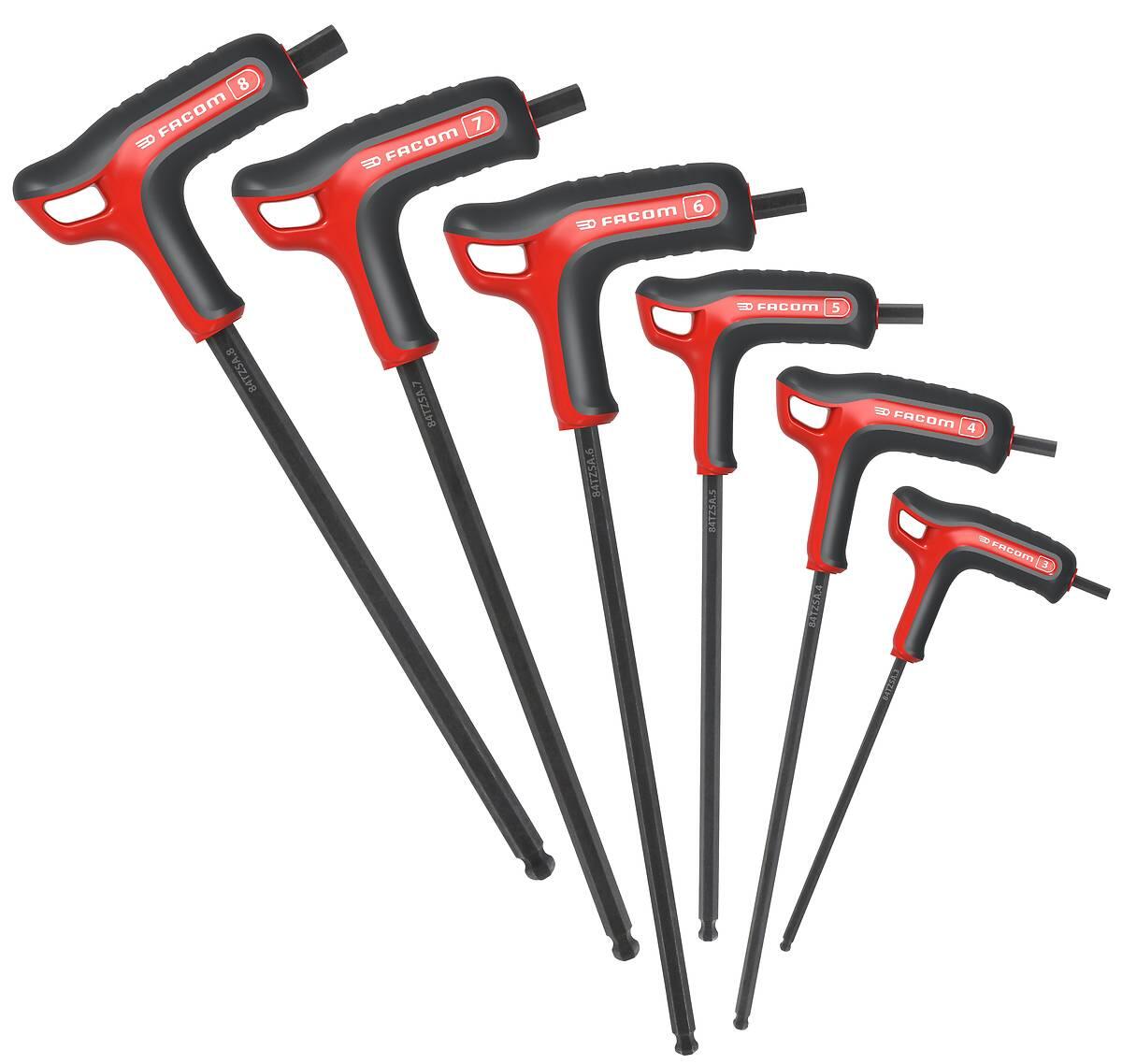 Jeu de 6 Clés à poignées en T 6 pans - Dimensions : 3 - 4 - 5 - 6 - 7 et 8 mm - Poignée souple pour plus de confort et pour appliquer plus de couple - Revêtement en silicium carbonne