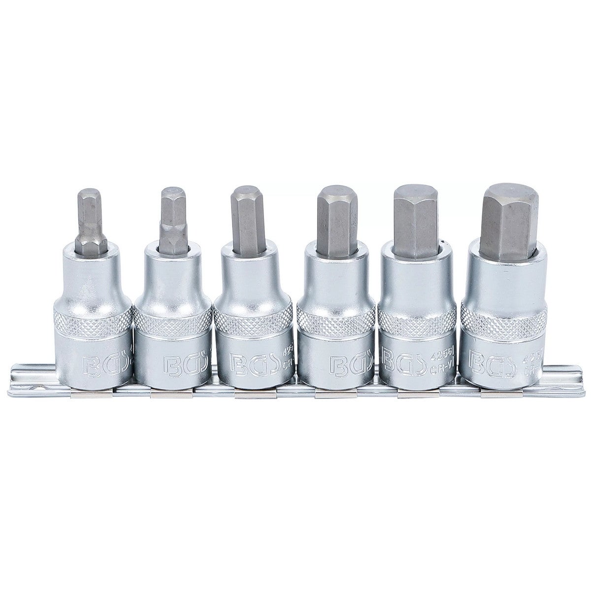 Jeu d'embouts à douille 6 pans métriques CHC, BTR, ALLEN de 6 à 14mm pour cliquet avec carré conducteur 1/2" (soit 12,7mm). Qualité professionnelle de marque BGS Technic. Matière : Acier Chrome Vanadium chromé mat. Longueur des douilles : 55mm sur rail support. Utilisable sur vis à tête 6 pans creuses (dites CHC).