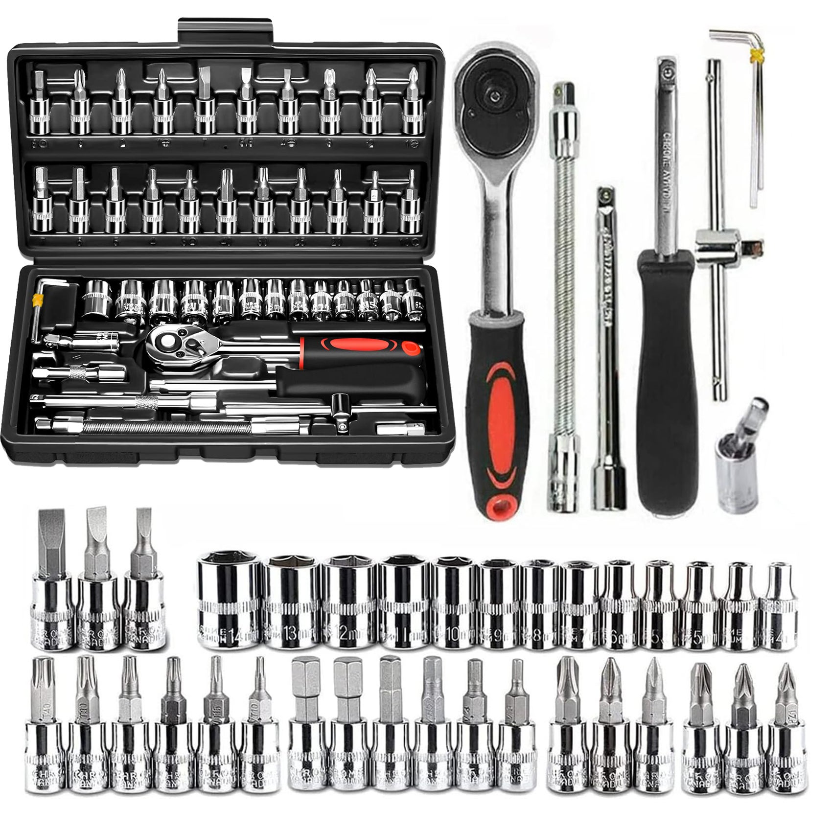 Jeu de clés à cliquet 1/4" de 46 pièces avec étui de rangement, comprenant des clés métriques et des rallonges pour la réparation automobile