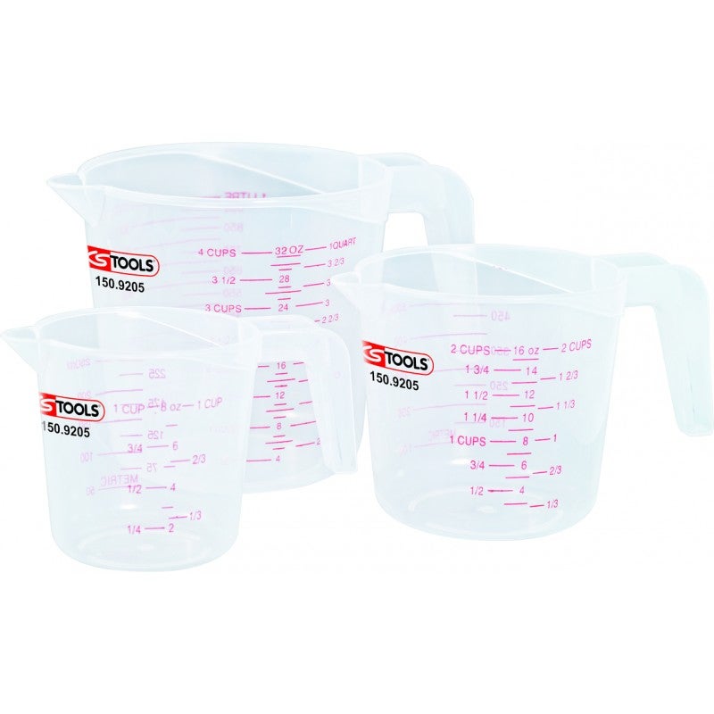 Assortiment de différentes tailles - Transparent - Graduation en rouge - Résistant aux hydrocarbures et aux acides - Anse et bec verseur - Polyéthylène - Graduation : L / ml, Cups, Oz, Quart