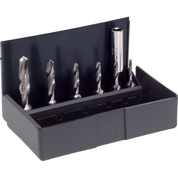 Jeu d'embouts mixtes, coffret plastique, Contenu : respectivement 1 foret taradeur M3 à M10 - M - Acier à coupe rapide - ISO 2 6H - Trou débouchant et trou borgne Livraison : dans un coffret en plastique Remarque : pour le perçage, le taraudage et l'ébavurage en une seule opération, avec queue hexagonale 1/4, pour filetage régulier ISO métrique DIN 13. Veillez à un alignement exact de l'axe de l'outil et de celui du trou et utilisez une huile de coupe appropriée."