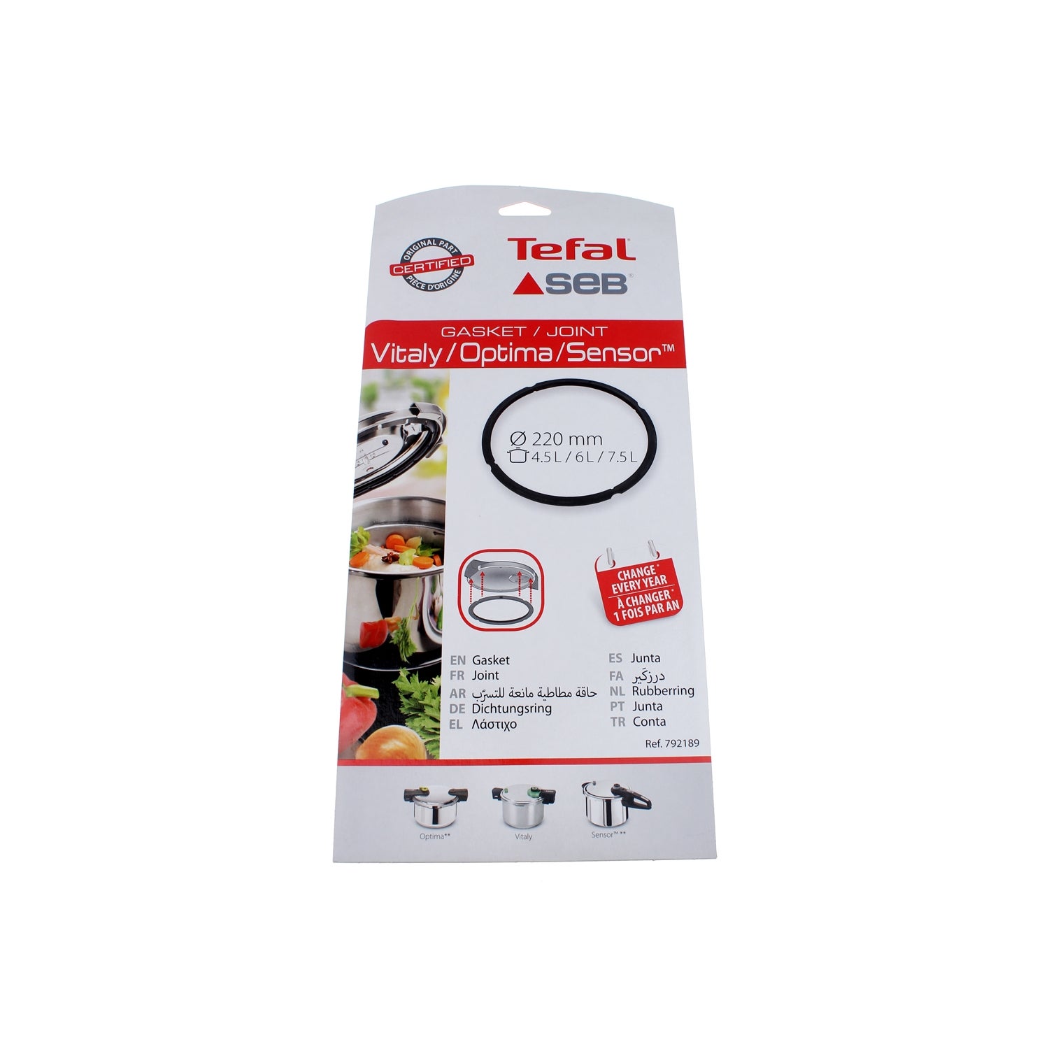 JOINT DE COUVERCLE AUTOCUISEUR SEBCUVE INOX 4,5 / 6 / 7,5 L - Diam. Intérieur 220 m/m VITALY - SENSOR 3 - SENSOR 2SENSOR SAFE 2 - SENSOR VISIO 792189 Avec le temps, le joint de l'autocuiseur s'use et le caoutchouc durcit. Vous constatez une fuite lors de la montée en pression. Il convient alors de le remplacer votre joint de cocotte. Cette opération est relativement simple et à la portée de tous.Choisir son joint :Le joint de couvercle doit être remplacé régulièrement. (Tous les ans en moyenne). Choisissez le joint adapté à votre autocuiseur.Afin de commander le bon joint, vous devez vous munir des éléments suivants : La marque de l'autocuiseur, Le diamètre de la cuve ou du couvercle et la capacité en litres de la cocotte-minute.Pour vous faciliter le montage du nouveau joint, plongez-le dans de l'eau savonneuse pour qu'il s'insère aisément.Si le joint est circulaire : repérez les marques sur le joint et insérez-le dans les encoches du couvercle prévu à cet effet. Toutes les pièces détachées d'origine SEB