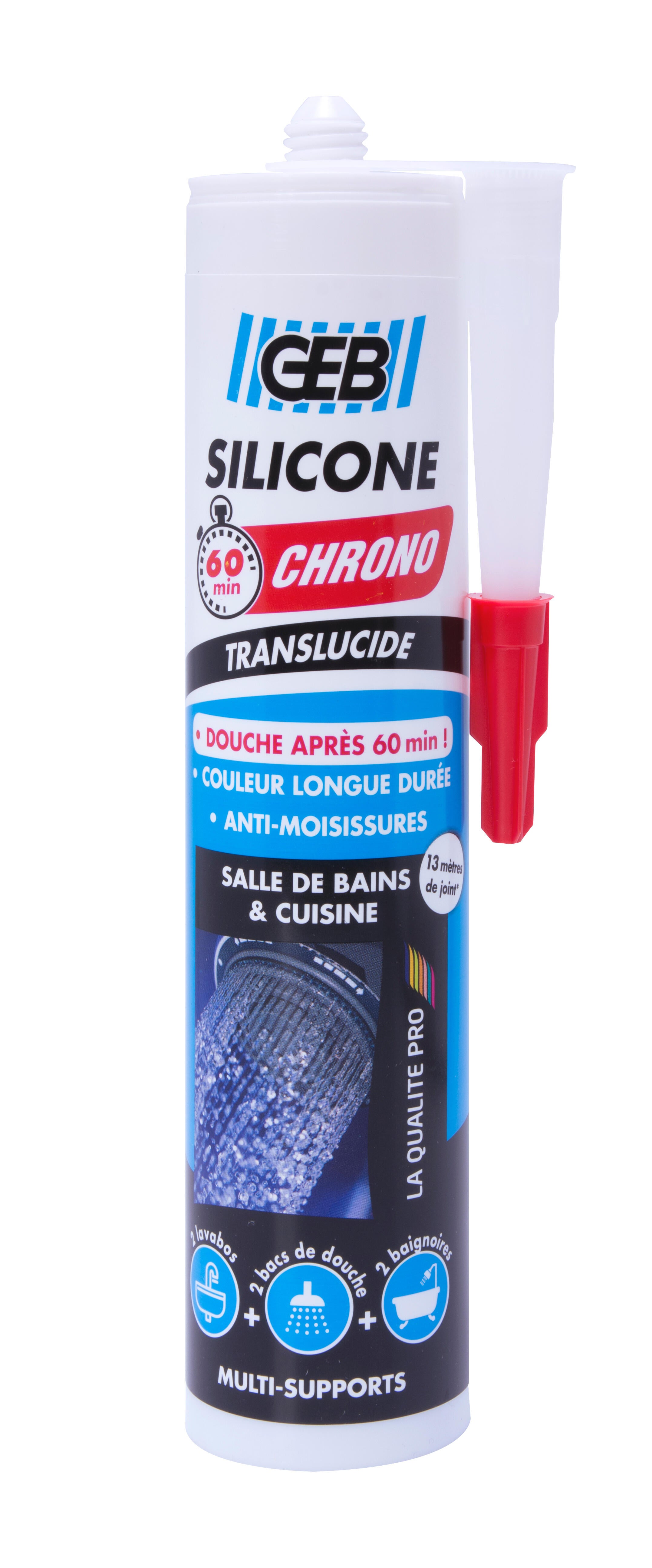 Silicone sanitaire séchage rapide. Remise en eau après 60 minutes. Mastic silicone acétique transparent - Qualité spéciale sanitaire, multi-supports.