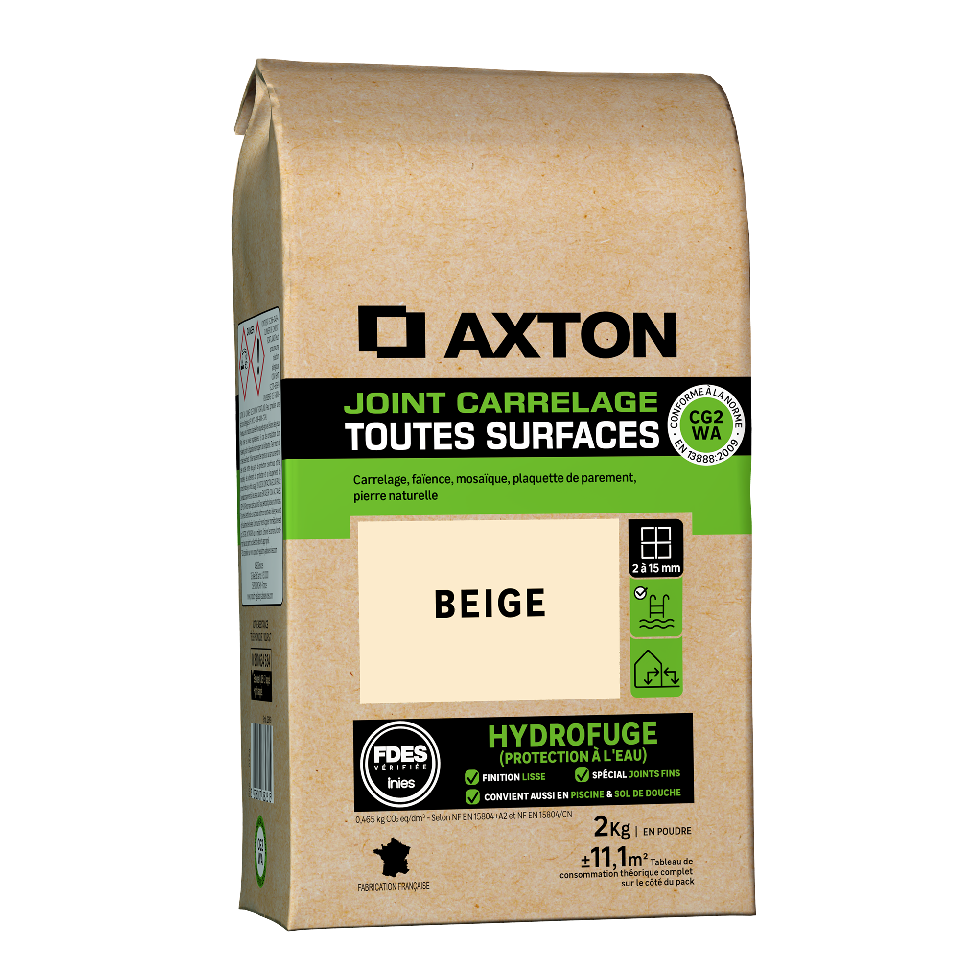 Joint Axton beige pour carrelage et toutes surfaces, idéal pour réaliser des joints de 2 à 15 mm d'épaisseur. Adapté au jointoiement de carrelage, faïence, mosaïque, bardages et pierres naturelles. Hydrofuge, ce produit peut être utilisé dans les piscines, sols et parois de douche. Compatible avec le chauffage au sol et poêle à bois à proximité. Sous forme de poudre, sa préparation est facile. Dans un seau, mélanger le produit avec de l'eau (quantité précise indiquée sur l'emballage) à l'aide d'un malaxeur jusqu'à obtenir une pâte homogène. Produit à impact environnemental réduit : avec sa nouvelle formule, ce joint Axton dispose d'une FDES (Fiche de Déclaration Environnementale et Sanitaire) vérifiée par l'INIES, et certifie l'émission de 0,465 kg CO₂ eq/dm³ tout au long du cycle de vie du produit