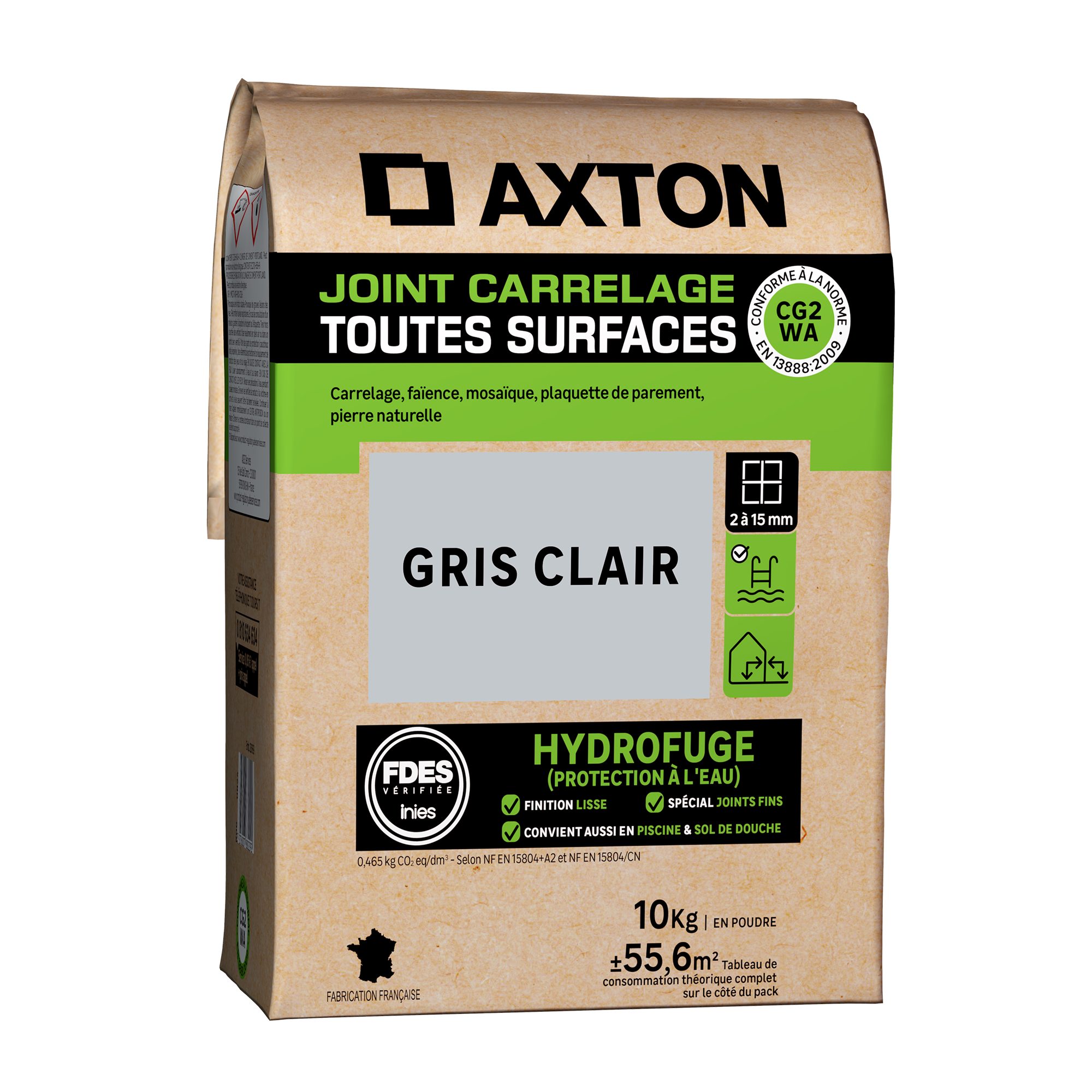 Joint Axton gris clair pour carrelage et toutes surfaces, idéal pour réaliser des joints de 2 à 15 mm d'épaisseur. Adapté au jointoiement de carrelage, faïence, mosaïque, bardages et pierres naturelles. Hydrofuge, ce produit peut être utilisé dans les piscines, sols et parois de douche. Compatible avec le chauffage au sol et poêle à bois à proximité. Sous forme de poudre, sa préparation est facile. Dans un seau, mélanger le produit avec de l'eau (quantité précise indiquée sur l'emballage) à l'aide d'un malaxeur jusqu'à obtenir une pâte homogène. Produit à impact environnemental réduit : avec sa nouvelle formule, ce joint Axton dispose d'une FDES (Fiche de Déclaration Environnementale et Sanitaire) vérifiée par l'INIES, et certifie l'émission de 0,465 kg CO₂ eq/dm³ tout au long du cycle de vie du produit