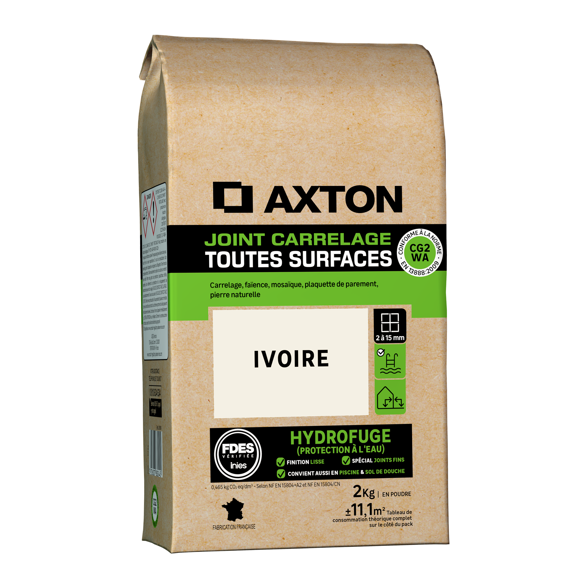 Joint Axton ivoire pour carrelage et toutes surfaces, idéal pour réaliser des joints de 2 à 15 mm d'épaisseur. Adapté au jointoiement de carrelage, faïence, mosaïque, bardages et pierres naturelles. Hydrofuge, ce produit peut être utilisé dans les piscines, sols et parois de douche. Compatible avec le chauffage au sol et poêle à bois à proximité. Sous forme de poudre, sa préparation est facile. Dans un seau, mélanger le produit avec de l'eau (quantité précise indiquée sur l'emballage) à l'aide d'un malaxeur jusqu'à obtenir une pâte homogène. Produit à impact environnemental réduit : avec sa nouvelle formule, ce joint Axton dispose d'une FDES (Fiche de Déclaration Environnementale et Sanitaire) vérifiée par l'INIES, et certifie l'émission de 0,465 kg CO₂ eq/dm³ tout au long du cycle de vie du produit