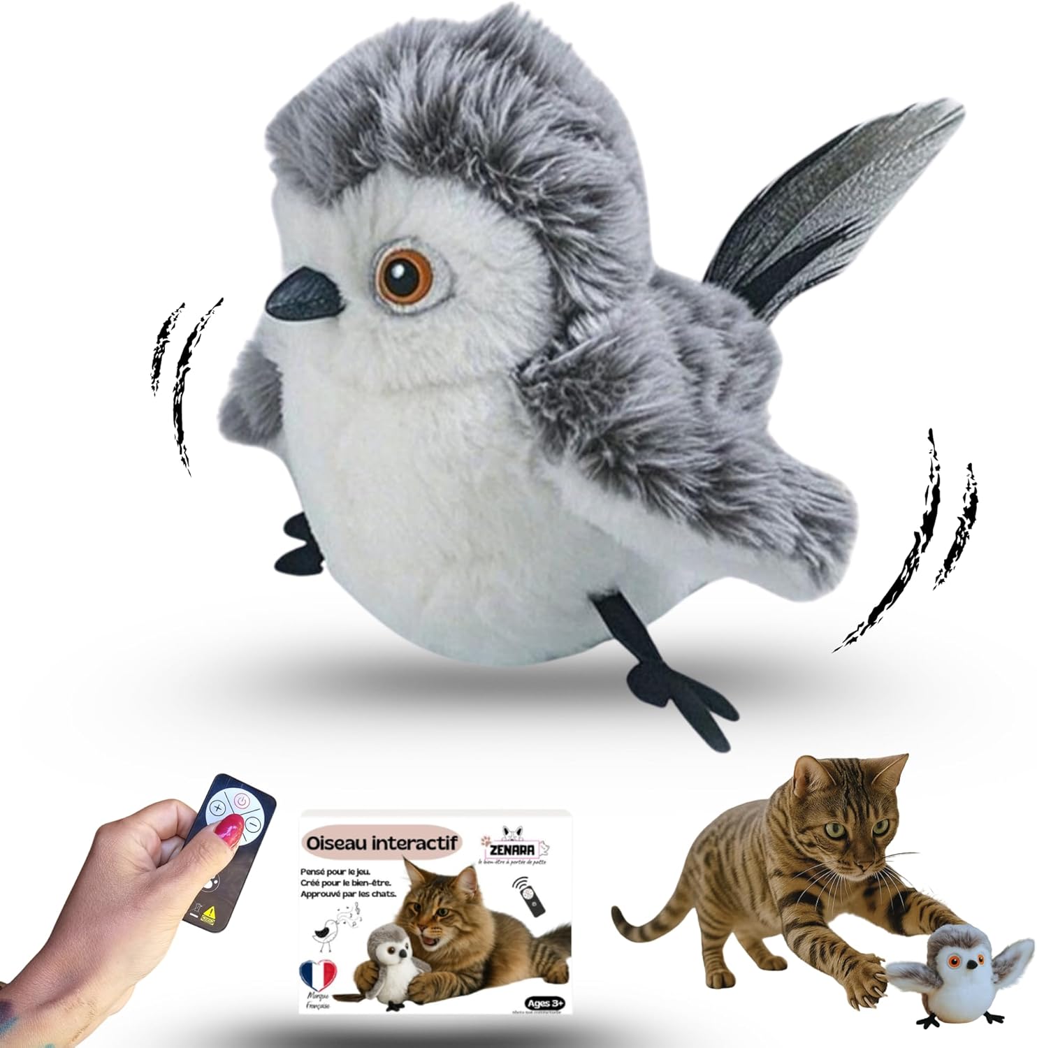 🕊️ 🐾[Oiseau qui éveille l'instinct de chasse] : Ce jouet réaliste en forme d'oiseau-chat stimule l'instinct de chasse naturel de votre chat. Ses battements d'ailes et ses gazouillis évoquent ceux d'un véritable oiseau-chat, créant une expérience immersive. Une télécommande assure un jeu ininterrompu. Il simule le vol grâce à la laisse incluse : l'oiseau ne vole pas, mais ses mouvements sont fidèlement reproduits. 🌿[Stimulant naturel pour attirer les chats] : Ce jouet interactif en forme d'oiseau-chat contient de l'herbe à chat naturelle, un véritable aimant à chats. Grâce à la laisse suspendue, il devient un jouet mobile qui captive les chats et les chatons. Il est parfait pour créer des liens et créer des moments de jeu intimes avec l'oiseau-chat qui gazouille. 🔊[Jouet adapté aux chats sensibles] : Le comportement interactif réaliste de cet oiseau-chat électrique, combiné à des sons naturels et à un toucher doux, en fait un excellent jouet anti-stress pour les chats. Silencieux, non irritant et sans agressivité, il est idéal pour les chats timides ou nerveux. 🎁 [Coffret cadeau exclusif pour prendre soin de votre chat] : En plus du jouet interactif, vous recevrez également un livre numérique exclusif de 38 pages rempli de conseils, d'astuces et d'erreurs à éviter pour l'utilisation des jouets d'intérieur. Ce guide pratique est téléchargeable via un QR code. Pour ceux qui veulent plus qu'un simple jouet : une expérience chat enrichissante 🐱❤️. 🔋 [Pas besoin de piles, jeu libre] : Ce jouet électrique pour chat est alimenté par une batterie USB rechargeable (câble inclus). Aucune pile requise ! Ce jouet rechargeable est toujours prêt à jouer, durable et idéal pour les familles actives et les amoureux des chats joueurs. 🇫🇷 [Qualité de marque française, conçu pour la santé] : Cet oiseau interactif pour chat est fabriqué à partir de matériaux sûrs, doux et non toxiques. Ses plumes naturelles et sa forme d'oiseau encouragent un jeu réaliste. Développé par une marque française dédiée, il allie sécurité, excitation et plaisir 💙🤍❤️. Idéal pour stimuler les chats d'intérieur : ce jouet pour chat et oiseau est idéal comme jouet d'intérieur ou jouet interactif pour chaton, conçu pour réduire le temps de sédentarité. Il encourage le mouvement, stimule l'esprit et soulage le stress. Le battement d'ailes réaliste, les sons naturels et l'herbe à chat intégrée encouragent votre compagnon à courir, sauter, chasser et jouer. C'est un excellent compagnon pour lutter contre l'ennui et contribuer à maintenir un équilibre physique, mental et émotionnel sain.