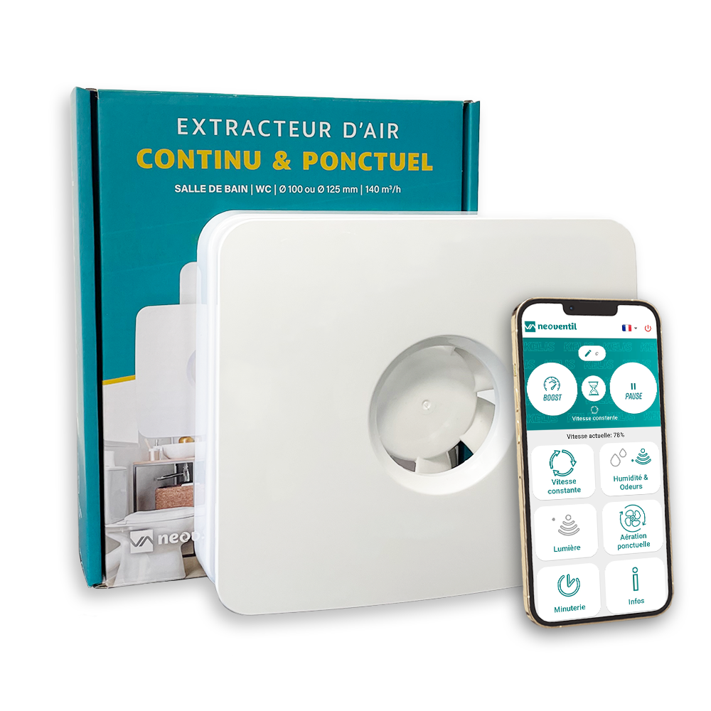 L'extracteur d'air KELIS NEOVENTIL est conçu pour une utilisation dans les cuisines, petits locaux, salles de bain ou WC, offrant une extraction continue ou ponctuelle de l'air vicié. Avec un design élégant et une installation polyvalente (murale ou au plafond), ce modèle se distingue par sa faible consommation d'énergie et son fonctionnement silencieux, à partir de seulement 19 dB. Doté d'un moteur amovible et très basse consommation, il facilite l'entretien et permet de régler les vitesses d'extraction pour s'adapter à différents besoins. L'extracteur dispose de diverses fonctionnalités, notamment une minuterie réglable, des détecteurs d'humidité avec trois seuils, ainsi que des détecteurs d'odeurs. En mode intermittent, il intègre une fonction de renouvellement d'air automatique après 26 heures d'inactivité. Il se connecte en BLUETOOTH à l'application Neoventil, permettant un contrôle à distance avec la possibilité de choisir entre différents modes, de le mettre en pause ou en mode boost.
