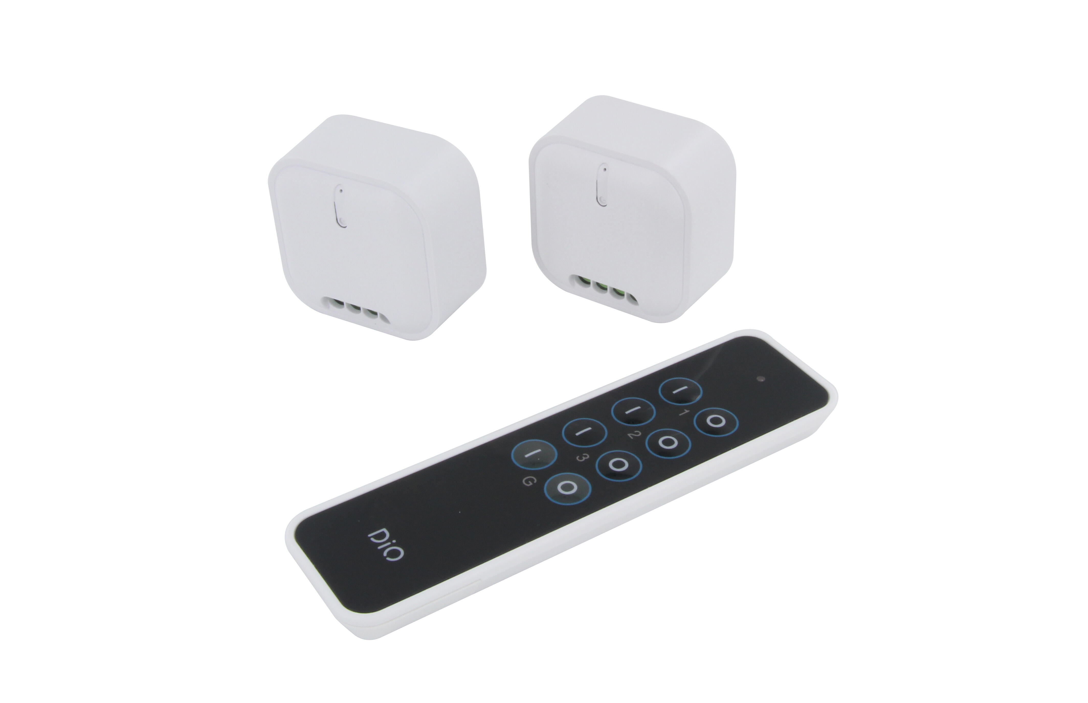 Commandez vos luminaires depuis votre canapé. Caractéristiques techniques • Fonction : On/Off • Puissance maximum du module : 1000W / 5A • Nombre maximum d’émetteur: jusqu’à 32 commandes • Télécommande: 3 canaux + 1 fonction groupe • Protocole radio: DiO 1.0 (433MHz) • Distance de transmission : 50m (en champs libre) Installation Raccorder chaque lampe dont vous souhaitez gérer la lumière à un module, d’enclencher la position « ON » de votre télécommande DiO pour la relier au module, et le tour est joué.