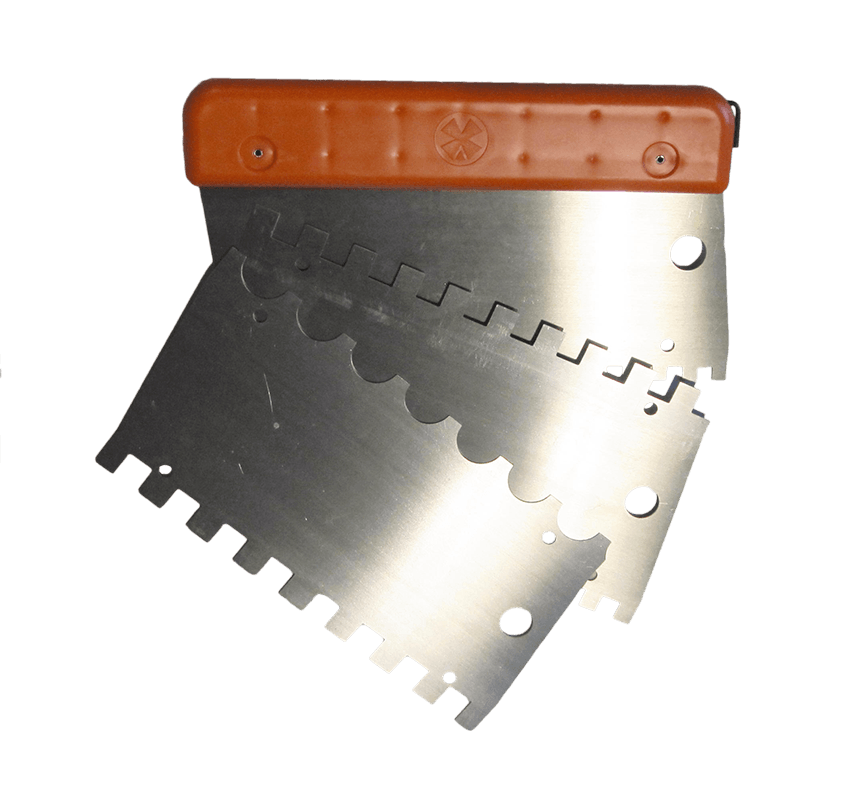 kit de peigne à colle avec 1 monture et 6 dentures Lames interchangeables - Pour l'encollage des carreaux de 10 x 30 cm à 60 x 60 cm en simple encollage, - Lames interchangeables et réversibles : 3 lames = 6 dentures, - Dentures : pointue 8 x 9 mm / carrée 6 x 6 x 6 mm, 8 x 8 x 8 mm, 10 x 10 x 10 mm, 12 x 12 x 12 mm / demi-ronde, - Lames interchangeables grâce à la clé de démontage incluse sur le côté de la poignée, - Lames en acier, - Poignée plastique pour protection de la main lors de la pose.