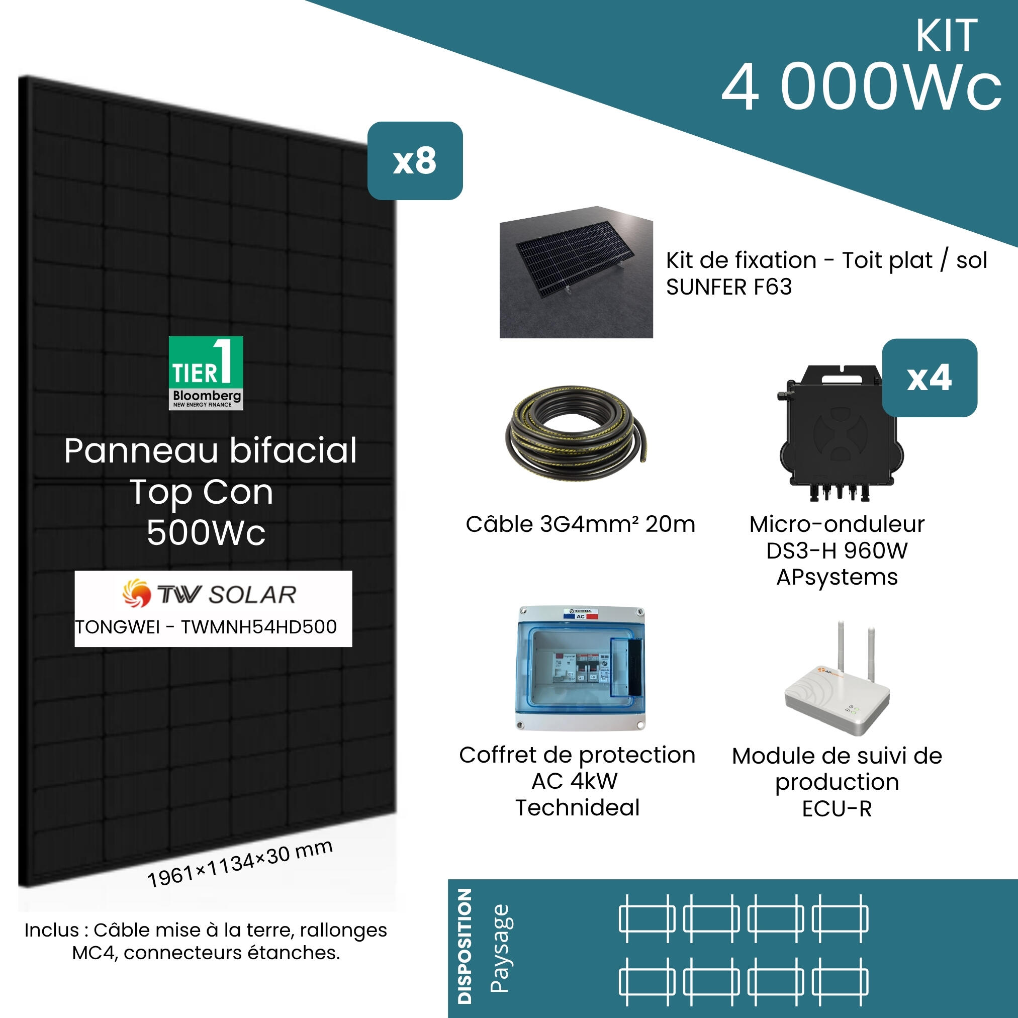 Kit Solaire Autoconsommation 4000 Wc– 8 Panneaux Photovoltaïques : Produisez et Consommez votre Électricité ! Réduisez vos factures d’énergie et devenez acteur de votre consommation grâce à ce kit solaire complet, conçu pour une installation simple et autonome. Composé de 8 panneaux photovoltaïques bifaciaux de grande marque pour une puissance totale de 4000 Wc et de tous les composants nécessaires, ce kit vous permet de produire votre propre électricité verte et de diminuer votre dépendance au réseau électrique. Les atouts de ce kit solaire : - Accompagnement technique inclus : notre hotline dédiée vous guide en cas de besoin lors de l’installation, du paramétrage et de la mise en service de votre kit. Nos experts vous apportent des conseils professionnels pour une installation toujours réussie. - Installation facile : Les fixations SUNFER F63 incluses permettent une installation sur un toit plat ou au sol. Que vous soyez bricoleur débutant ou expérimenté, la notice détaillée et la vidéo tutorielle disponibles sur notre site vous accompagnent pas à pas. - Performance et durabilité : Les composants de haute qualité garantissent une production fiable et durable d'au moins 25 ans, pour un investissement rentable. - Suivi en temps Réel : Grâce aux micro-onduleurs DS3-H de 960W et à la passerelle de communication APSYSTEM ECU-R, visualisez en direct ou en cumul l’énergie produite de votre logement. Cette interface vous permet d'adapter vos habitudes (par exemple, lancer vos appareils électroménagers en journée) lorsque vous produisez pour maximiser vos économies. - Sécurité garantie : Le kit comprend un coffret de protection électrique qui sécurise l’ensemble de l’installation et protège les utilisateurs. Compatible avec les installations monophasées et triphasées. La production est stoppée lorsque le réseau électrique n'est plus disponible (par ENEDIS, ou depuis le disjoncteur abonné). Un geste pour la planète et votre portefeuille. Plus votre autoconsommation sera élevée, plus votre installation sera amortie rapidement Produire votre propre électricité photovoltaïque est également une solution efficace pour réduire votre empreinte carbone tout en maîtrisant vos dépenses énergétiques. Ce kit solaire vous offre une démarche responsable et économique. Important : Ce kit est conçu pour l’autoconsommation et nécessite un raccordement au réseau électrique.