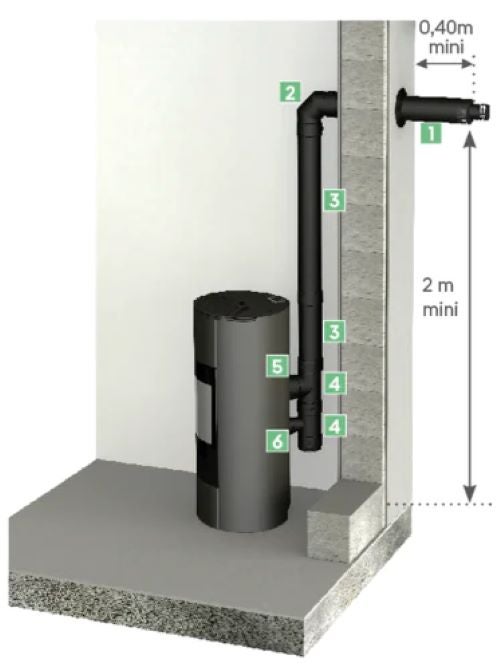 APOLLO PELLET CONCENTRIQUE Kit raccordement étanche horizontal comprenant: -Conduit horizontal (livré avec 2 rosaces EPDM) -1 Elément 1000 mm, 1 élément réglable de 350 à 550 mm, 1 Coude à 90° - 1 Té 90° avec piquage prise d'air diam 60 - 1 Té 90° avec piquage Evacuation fumées + tampon - 1 Gaine alu prise d'air diam 60 - 1 Adaptateur EPDM prise d'air diam60à diam40, 1 adaptateur mâle/Femelle diam80. diam int: 80 diam ext: 125 Couleur noir. Application : Appareils à combustible granulés de bois (pellets) poêles étanches. Configuration concentrique à circuit de combustion étanche avec Conduit horizontal. Innovations techniques : Gamme marquée CE et titulaire d'un avis technique. Finition particulirement esthétique pour l'installation dans la piceà vivre. Disponible finition inox. Conduit Classé G, résistant au feu de cheminée.