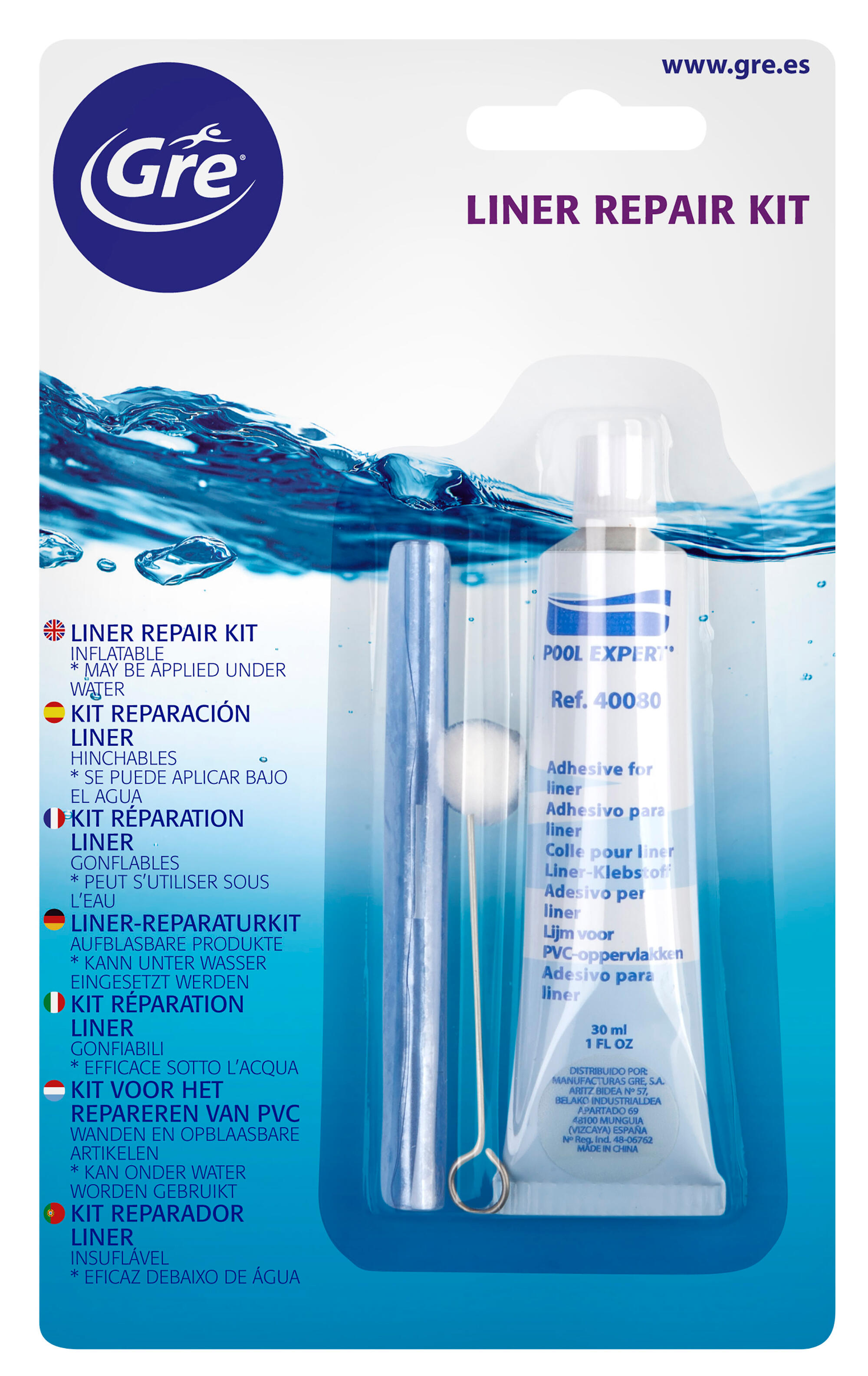 Kit de réparation liquide de liner de 5 ml. Répare les liners cassés ou d'autres articles en PVC soufflé. Le kit de réparation du liner est préparé pour une application sous l'eau. Comprend : un tube de colle, deux patchs de 10x20cm et un bâtonnet applicateur.