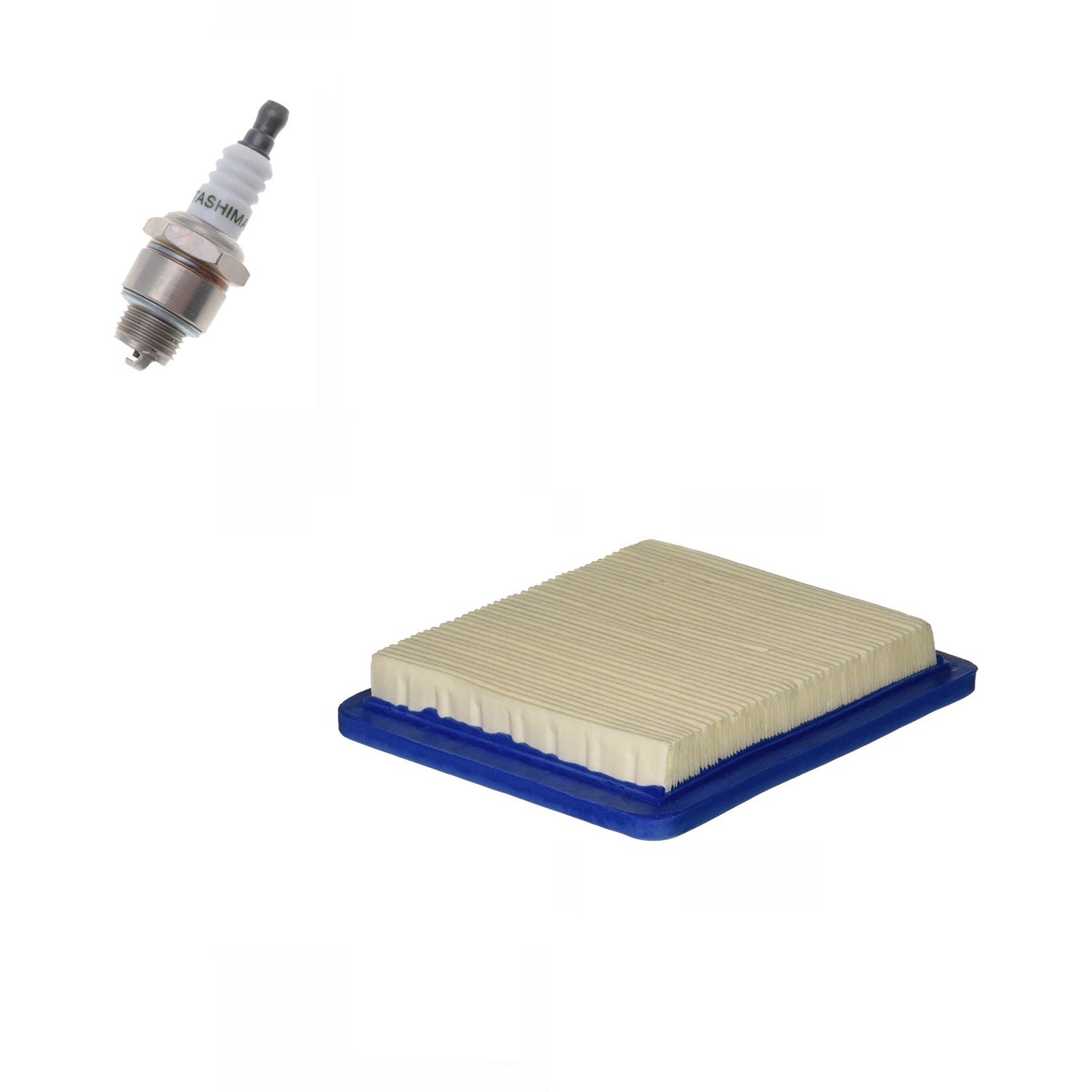 Ensemble bougie (équivalences : NGK BR2LM, B4LM, Champion RJ17LM, RJ19LM, Tashima) et filtre à air (équivalence 491588, dimensions 130mm x 112mm x 20mm) compatible avec Briggs Stratton type Quantum (autres modèles possibles vérifier vos références de pièces).